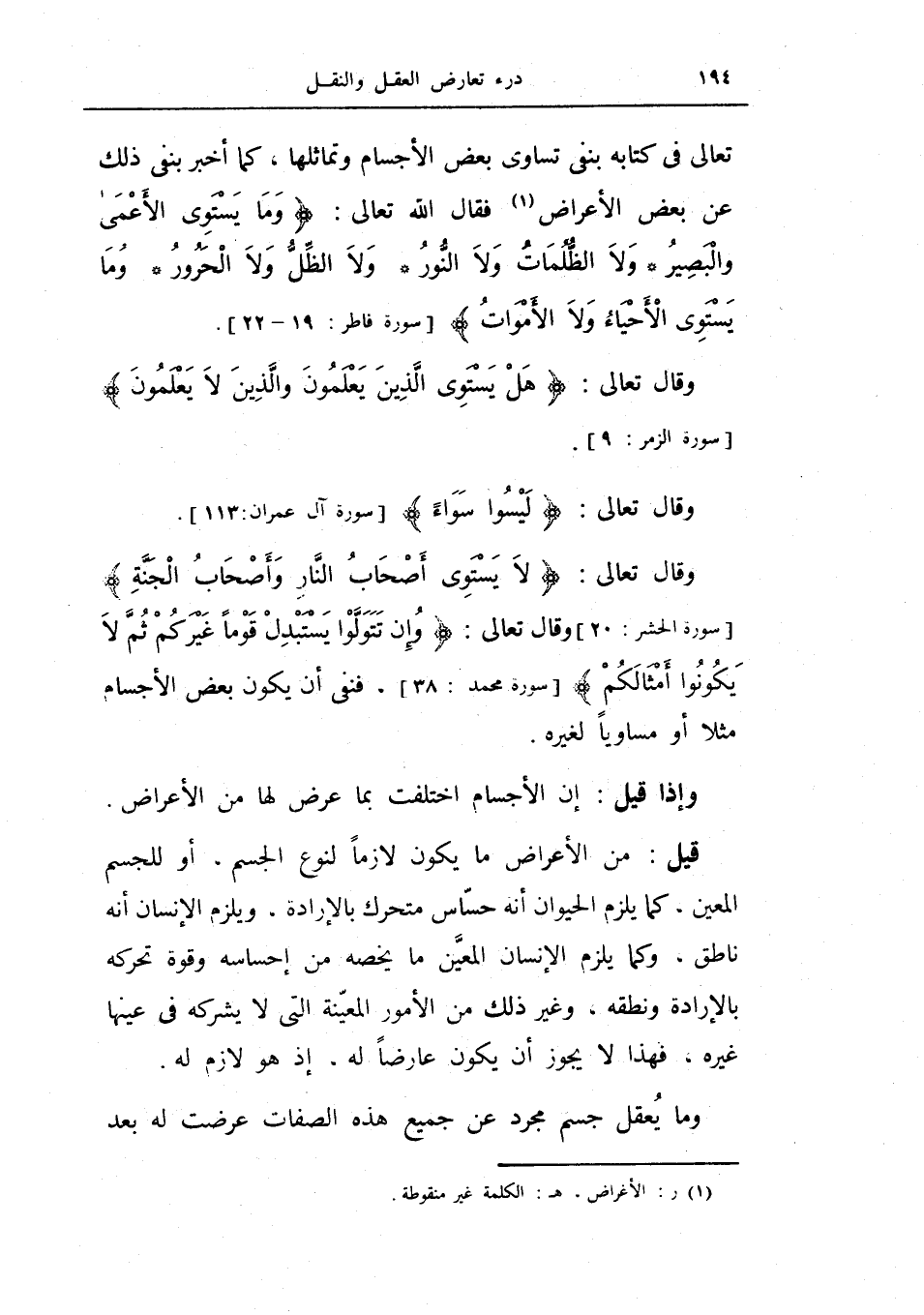 تعالى في كتابه بنفي تساوي بعض الأجسام وتماثلها، كما أخبر بنفي ذلك عن بعض الأعراض فقال الله تعالى: {وما يستوي الأعمى والبصير * ولا الظلمات ولا النور * ولا الظل ولا الحرور * وما يستوي الأحياء ولا الأموات} فاطر 19 - 22.