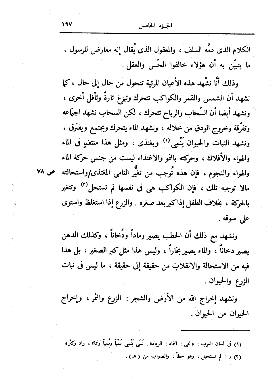 وذلك أنا نشهد هذه الأعيان المرئية تتحول من حال إلى حال، كما نشهد أن الشمس والقمر والكواكب تتحرك وتبزغ تارة وتأفل أخرى، ونشهد أيضاً أن السحاب والرياح تتحرك، لكن السحاب نشهد اجتماعه وتفرقه وخروج الودق من خلاله، ونشهد الماء يتحرك ويجتمع ويفترق، ونشهد النبات والحيوان ينمي ويعتدي ومثل هذا منتف في الماء والهواء والأفلاك، وحركته بالنمو والاغتذاء ليست من جنس حركة الماء والهواء والنجوم، فإن هذه توجب من تغير النامي المغتذي واستحالته مالا توجبه تلك، فإن الكواكب هي في نفسها لم تستحل وتغير بالحركة، بخلاف الطفل إذا كبر بعد صغره والزرع إذا استغلظ واستوى على سوقه.