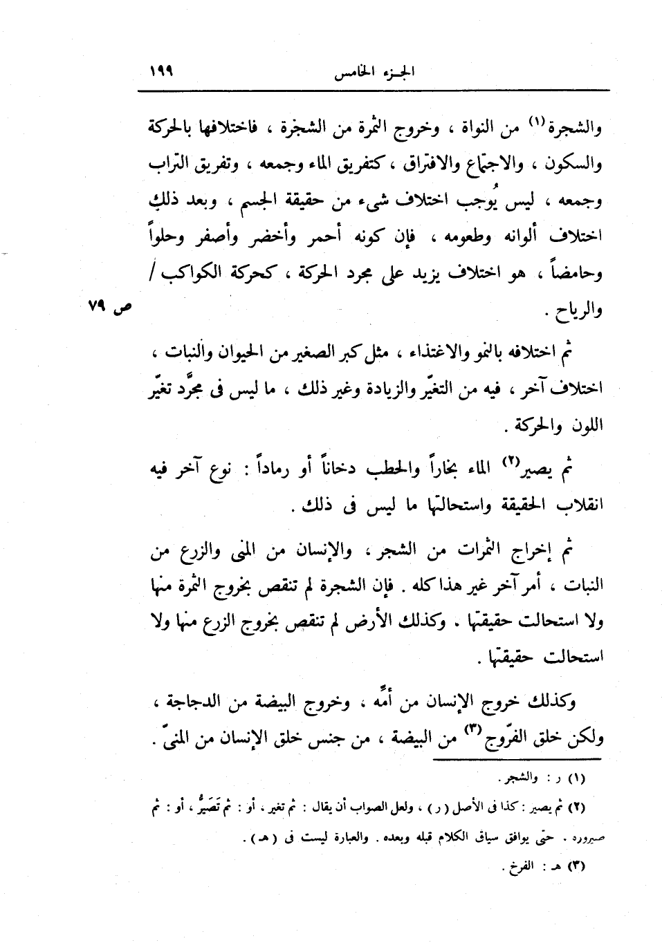 والشجرة من النواة، وخروج الثمرة من الشجرة، فاختلافها بالحركة والسكون، والاجتماع والافتراق، كتفريق الماء وجمعه، وتفريق التراب وجمعه، ليس يوجب اختلاف شيء من حقيقة الجسم، وبعد ذلك اختلاف ألوانه وطعومه فإن كونه أحمر وأخضر وأصفر وحلواً وحامضاً، هو اختلاف يزيد على مجرد الحركة كحركة الكواكب والرياح.