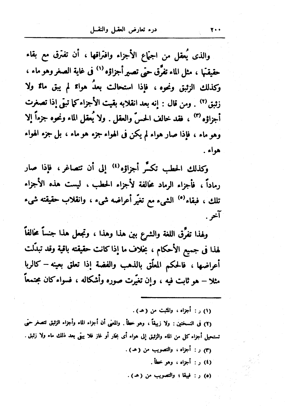 والذي يعقل من اجتماع الأجزاء وافتراقها أن تفترق مع بقاء حقيقتها مثل الماء تفرق حتى تصير أجزاؤه في غاية الصغر وهو ماء وكذلك الزئبق ونحوه فإذا استحالت بعد هواء لم يبق ماء ولا زئبق ومن قال إنه بعد انقلابه بقيت الأجزاء كما تبقى إذا تصغرت أجزاؤه فقد خالف الحس والعقل ولا يعقل الماء ونحوه جزءاً إلا وهو ماء فإذا صار هواء لم يكن في الهواء جزء هو ماء بل جزء الهواء هواء.