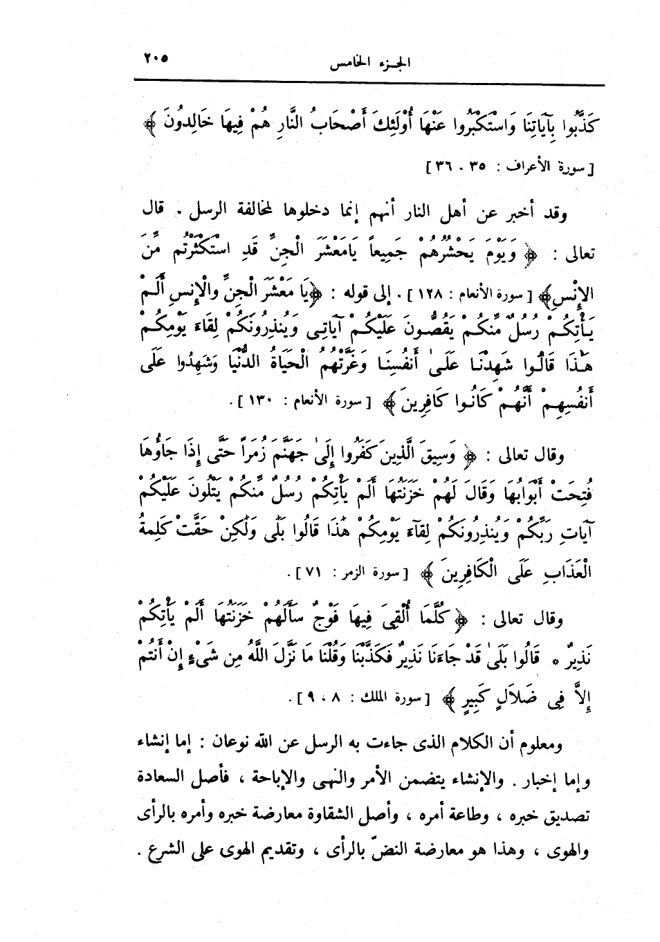 وقد أخبر عن أهل النار أنهم إنما دخلوها لمخالفة الرسل، قال تعالى: {ويوم يحشرهم جميعا يا معشر الجن قد استكثرتم من الإنس} [الأنعام: 128] ، إلى قوله: {يا معشر الجن والإنس ألم يأتكم رسل منكم يقصون عليكم آياتي وينذرونكم لقاء يومكم هذا قالوا شهدنا على أنفسنا وغرتهم الحياة الدنيا وشهدوا على أنفسهم أنهم كانوا كافرين} [الأنعام: 130] .