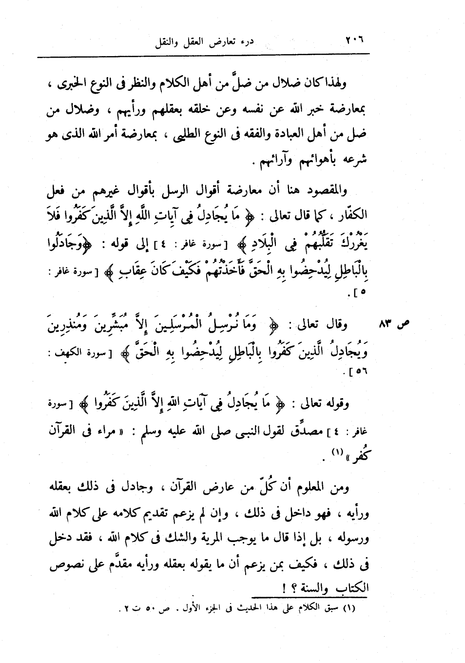 ومن المعلوم أن كل من عارض القرآن، وجادل في ذلك بعقله ورأيه، فهو داخل في ذلك، وإن لم يزعم تقديم كلامه على كلام الله ورسوله، بل إذا قال ما يوجب المرية والشك في كلام الله، فقد دخل في ذلك، فكيف بمن يزعم أن ما يقوله بعقله ورأيه مقدم على نصوص الكتاب والسنة.