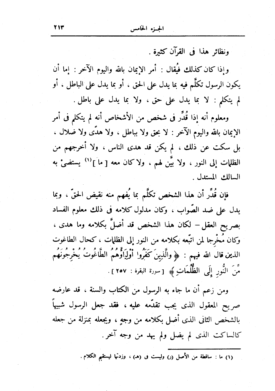 ومعلوم أنه إذا قدر في شخص من الأشخاص أنه لم يتكلم في أمر الإيمان بالله واليوم الآخر: لا بحق ولا بباطل، ولا هدى ولا ضلال، بل سكت عن ذلك، لم يكن قد هدى الناس، ولا أخرجهم من الظلمات إلى النور، ولا بين لهم، ولا كان معه ما يستضيء به السالك المستدل.