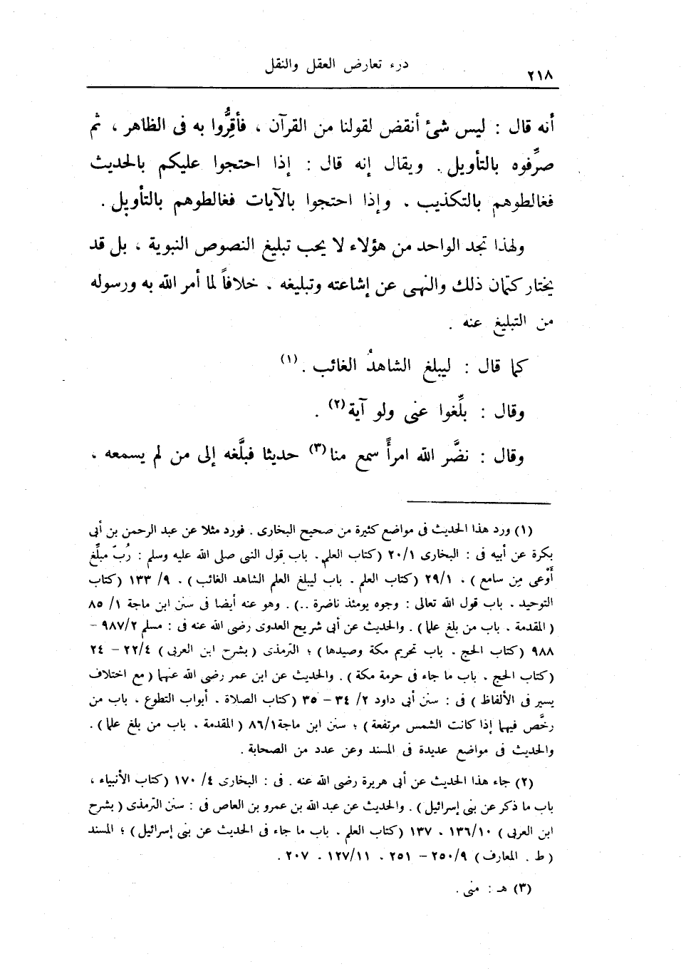 ولهذا تجد الواحد من هؤلاء لا يحب تبليغ النصوص النبوية، بل قد يختار كتمان ذلك والنهي عن إشاعته وتبليغه خلافاً لما أمر الله به ورسوله من التبليغ عنه.