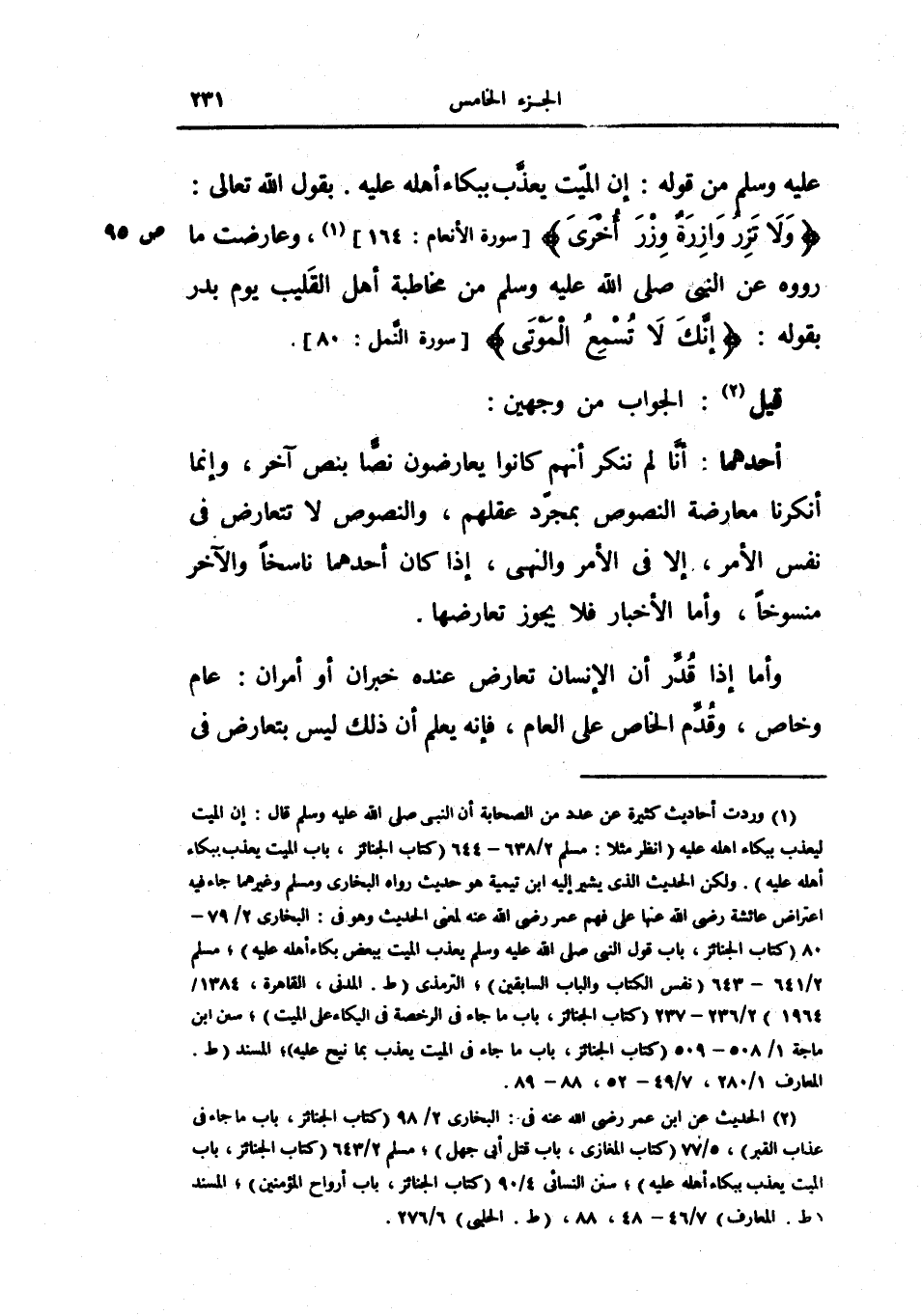 أحدهما: أنا لم ننكر انهم كانوا يعارضون نصاً بنص آخر، وإنما أنكرنا معارضة النصوص بمجرد عقلهم، والنصوص لا تتعارض في نفس الأمر، إلا في الأمر والنهي، إذا كان أحدهما ناسخاً والآخر منسوخاً، وأما الأخبار فلا يجوز تعارضها.