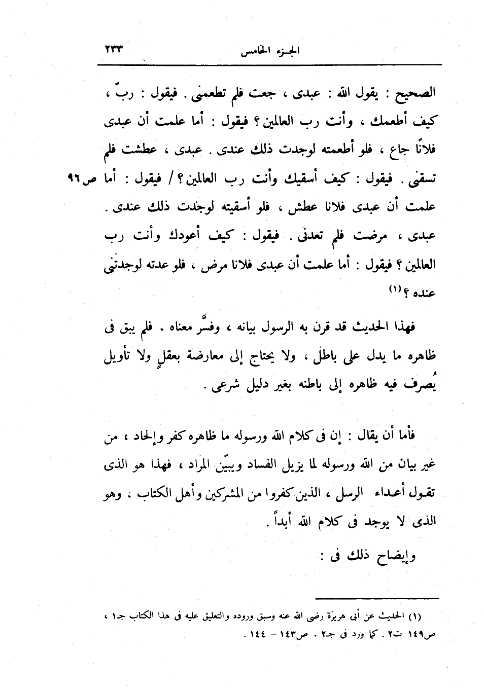فيقول: كيف أسقيك وأنت رب العالمين؟ فيقول: أما علمت أن عبدي فلانا عطش، فلو أسقيته لوجدت ذلك عندي.