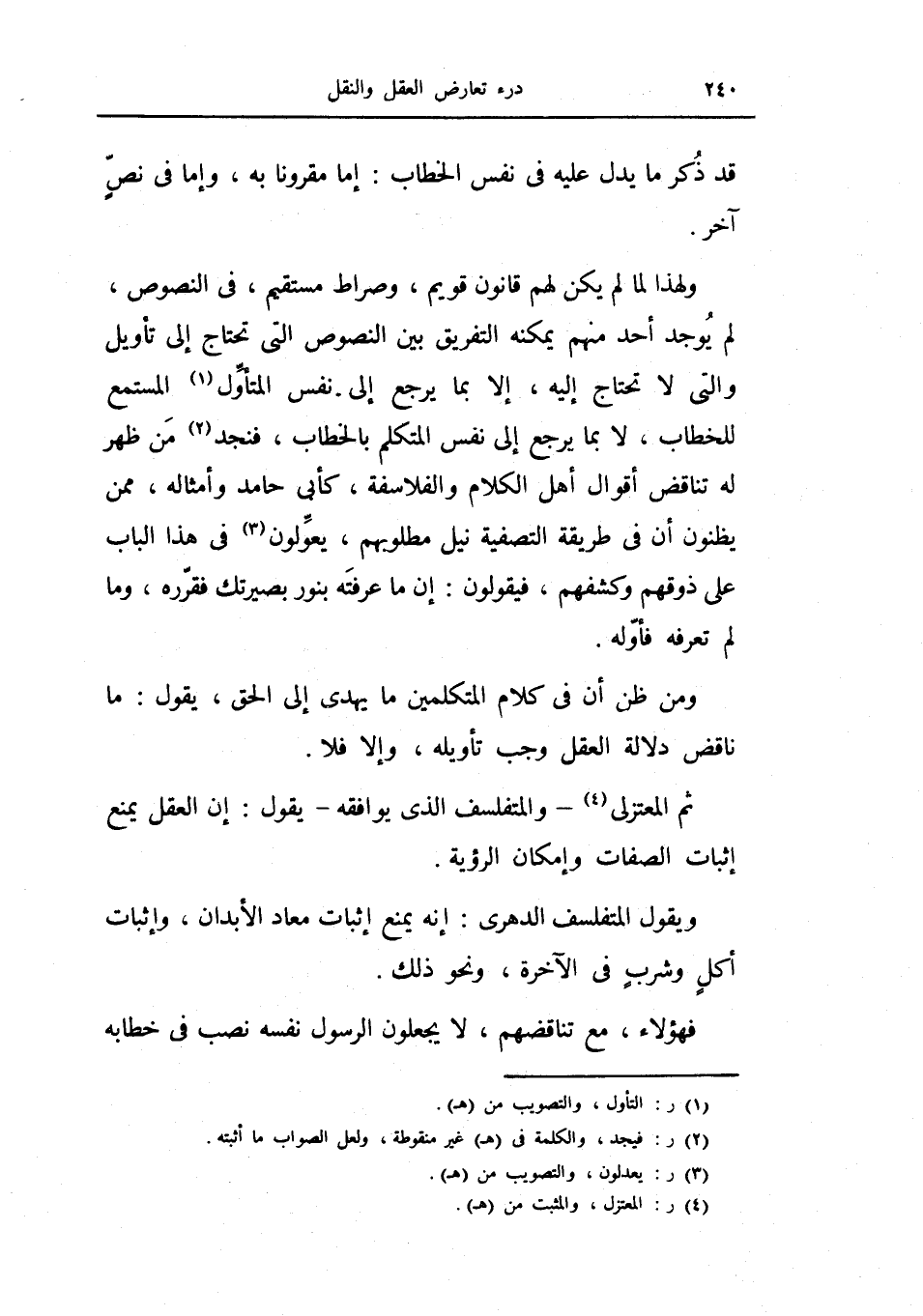 ولهذا لما لم يكن لهم قانون قويم، وصراط مستقيم، في النصوص لم يوجد أحد منهم يمكنه التفريق بين النصوص التي تحتاج إلى تأويل والتي لا تحتاج إليه، إلا بما يرجع إلى نفس المتأول المستمع للخطاب، لا بما يرجع إلى نفس المتكلم بالخطاب، فنجد من ظهر له تتناقض أقوال أهل الكلام والفلاسفة، كأبي حامد وأمثاله، ممن يظنون أن في طريقة التصفية نيل مطلوبهم، يعولون في هذا الباب على ذوقهم وكشفهم، فيقولون: إن ما عرفته بنور بصيرتك فقرره، وما لم تعرفه فأوله.