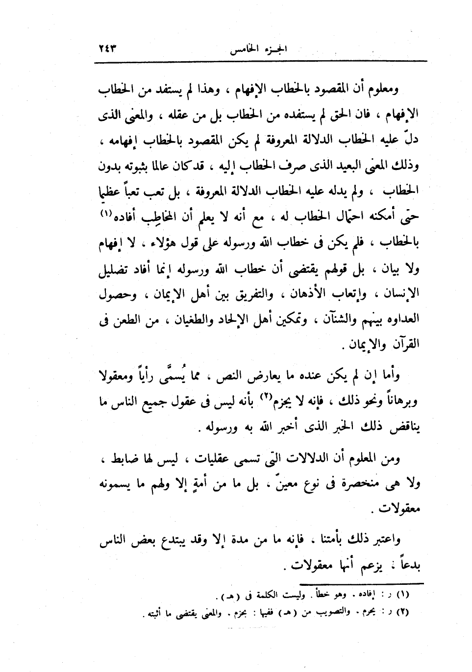 ومعلوم أن المقصود بالخطاب والإفهام، وهذا لم يستفد من الخطاب والإفهام، فإن الحق لم يستفده من الخطاب بل من عقله، والمعنى الذي دل عليه الخطاب الدلالة المعروفة لم يكن المقصود بالخطاب إفهامه، وذلك المعنى البعيد الذي صرف الخطاب إليه، قد كان عالما بثبوته بدون الخطاب، ولم يدل عليه الخطاب الدلالة المعروفة، بل تعب تعباً عظيما حتى أمكنه احتمال الخطاب له، مع أنه لا يعلم أن المخاطب أفاده بالخطاب، فلم يكن له خطاب الله ورسوله على قول هؤلاء، لا إفهام ولا بيان، بل قولهم يقتضي أن خطاب الله ورسوله إنما أفاد تضليل الإنسان، وإتعاب الأذهان، والتفريق بين أهل الإيمان، وحصول العداوة بينهم والشنآن، وتمكين أهل الإلحاد والطغيان، من الطعن في القرآن والإيمان.
