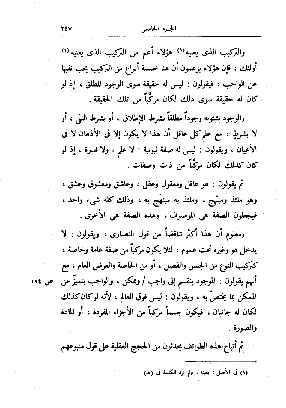 والتركيب الذي يعنيه هؤلاء أعم من التركيب الذي يعنيه أولئك، فإن هؤلاء يزعمون أن هنا خمسة أنواع من التركيب يجب نفيها عن الواجب، فيقولون ليس له حقيقة سوى الوجود المطلق، إذ لو كان له حقيقة سوى ذلك لكان مركباً من تلك الحقيقة.