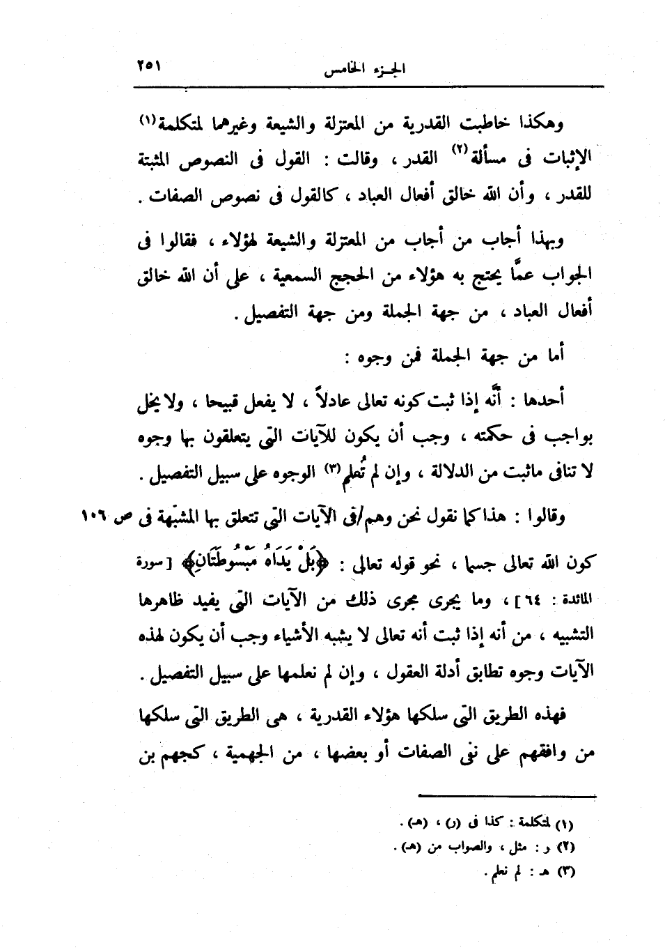 وهكذا خاطبت القدرية من المعتزلة والشيعة وغيرهما لمتكلمة الإثبات في مسألة القدر، وقالت: القول في النصوص المثبتة للقدر، وأن الله خالق أفعال العباد، كالقول في نصوص الصفات.