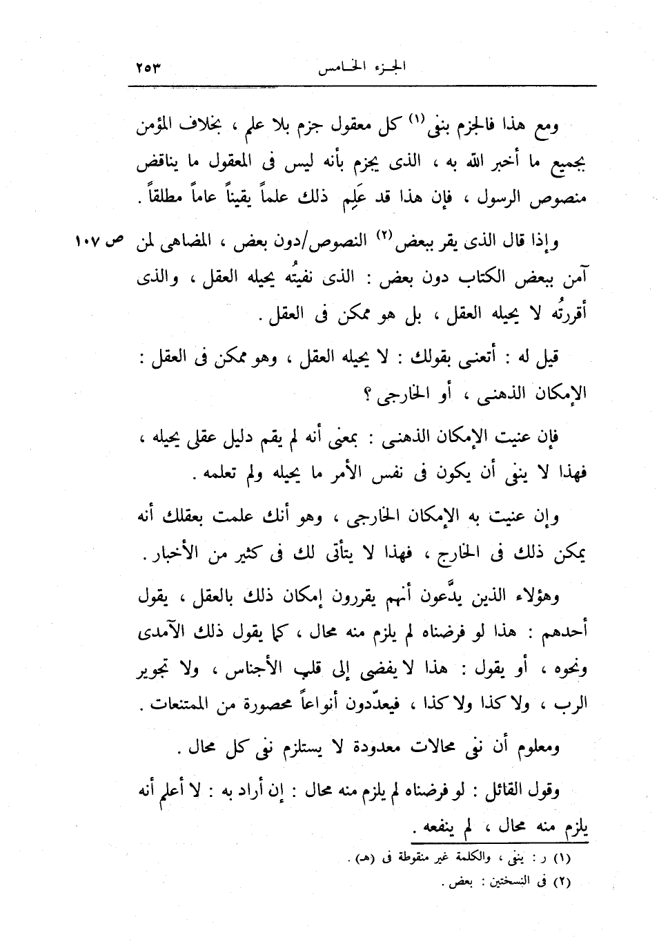 وإذا قال الذي يقر ببعض النصوص دون البعض، المضاهي لمن آمن ببعض الكتاب دون بعض: الذي نفيته يحيله العقل، والذي أقررته لا يحيله العقل، بل هو ممكن في العقل.