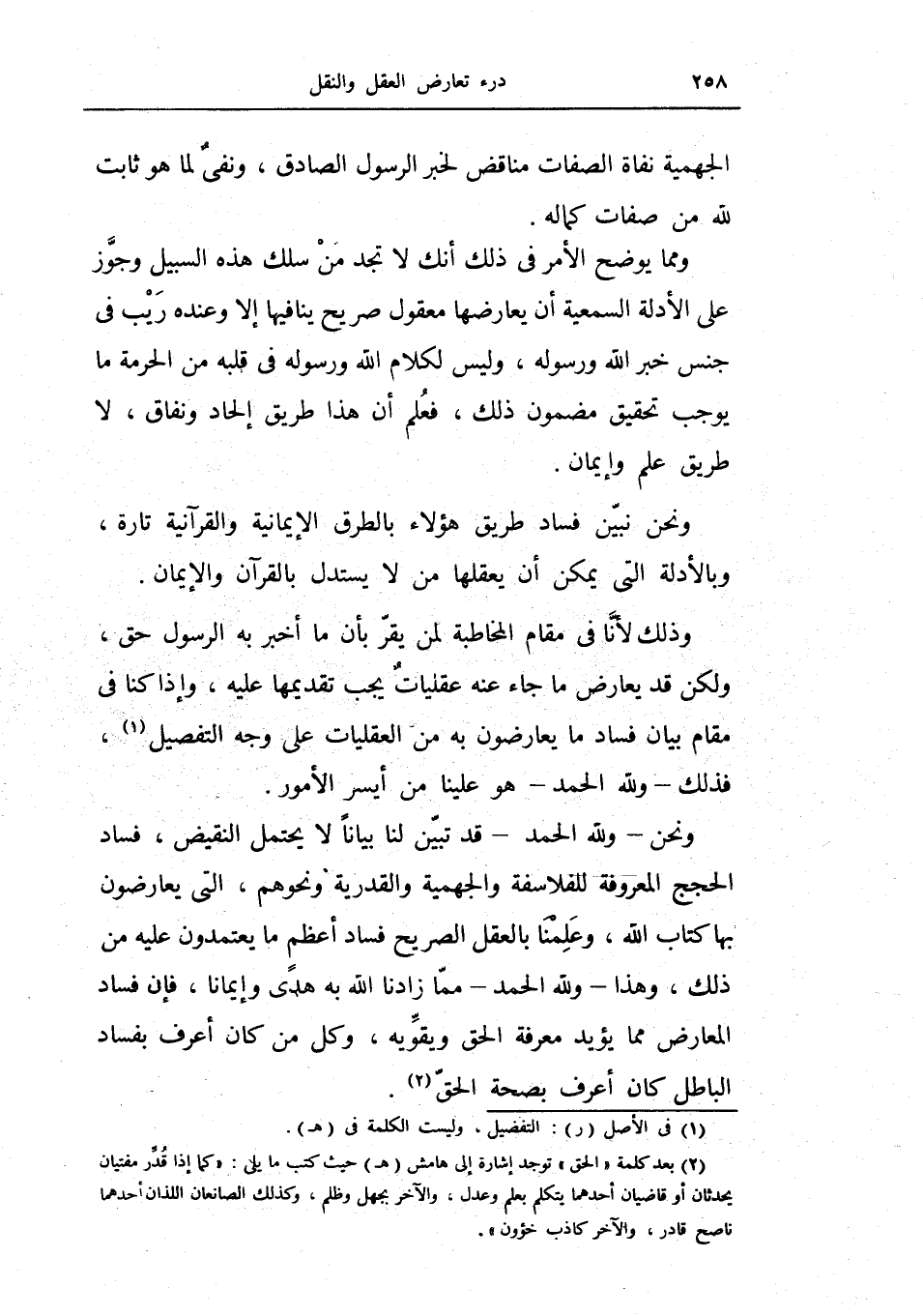 وذلك لأنا في مقام الخاطبة لمن يقر بأن ما أخبر به الرسول حق، ولكن قد يعارض ما جاء عنه عقليات يجب تقديمها عليه، وإذا كنا في مقام بيان فساد ما يعارضون به من العقليات على وجه التفصيل، فذلك- ولله الحمد- هو علينا من أيسر الأمور.