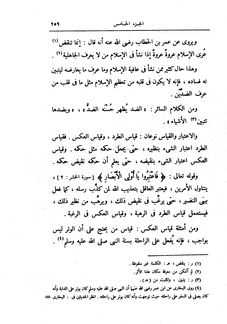 وقوله تعالى: {فاعتبروا يا أولي الأبصار} [الحشر: 2] ، يتناول الأمرين، فيعتبر العاقل بتعذيب الله لمن كذب رسله، كما فعل ببني النضير، حتى يرغب في نقيض ذلك، ويرهب من نظير ذلك، فيستعمل قياس الطرد في الرهبة، وقياس العكس في الرغبة.