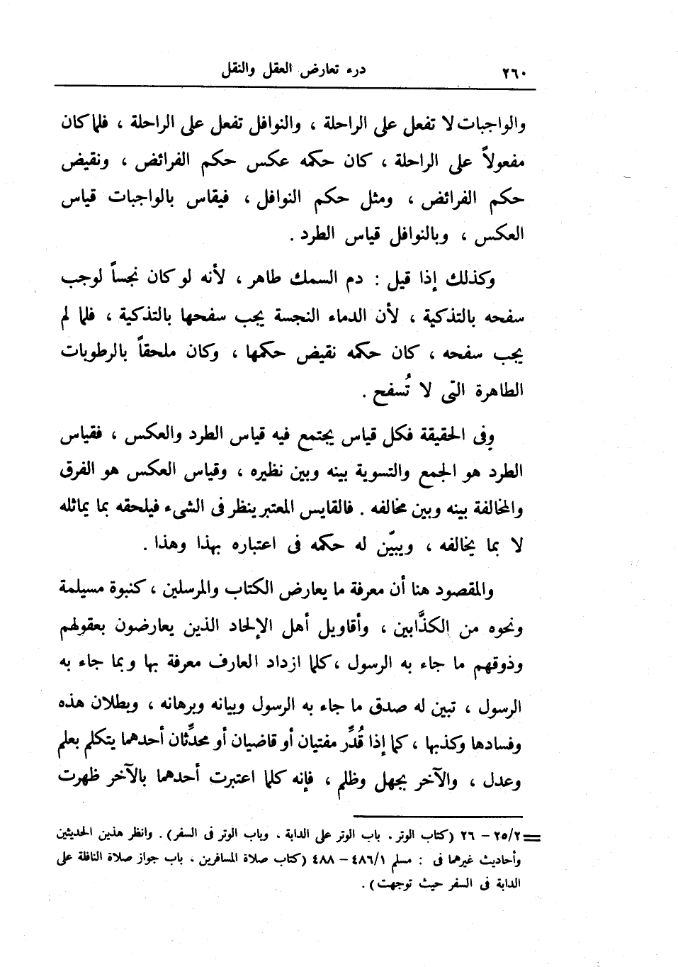 والواجبات لا تفعل على الراحلة، والنوافل تفعل على الراحلة، فلما كان مفعولاً على الراحلة، كان حكمه عكس حكم الفرائض، ونقيض حكم الفرائض، ومثل حكم النوافل، فيقاس بالواجبات قياس العكس، وبالنوافل قياس الطرد.