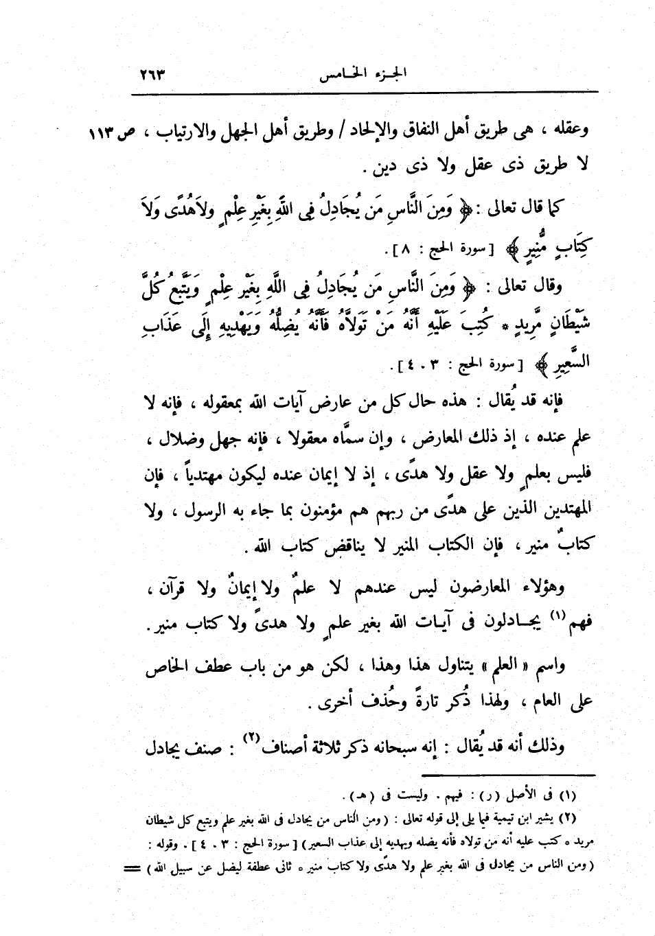 فإنه قد يقال: هذه حال كل من عارض آيات الله بمعقوله، فإنه لا علم عنده، إذ ذلك المعارض، وإن سماه معقولا، فإنه جهل وضلال، فليس بعلم ولا عقل ولا هدى، إذ لا إيمان عنده ليكون مهتدياً، فإن المهتدين الذين على هدى من ربهم هم مؤمنون بما جاء به الرسول، ولا كتاب منير، فإن الكتاب المنير لا يناقض كتاب الله.