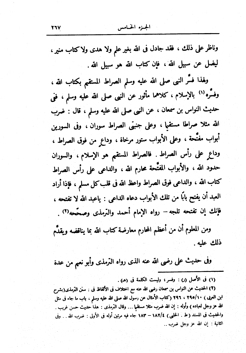ولهذا فسر النبي صلى الله عليه وسلم الصراط المستقيم بكتاب الله، وفسره بالإسلام، كلاهما مأثور عن النبي صلى الله عليه وسلم، ففي حديث النواس بن سمعان، النبي صلى الله عليه وسلم، قال: «ضرب الله مثلاً صراطا مستقيما، وعلى جنبتي الصراط سوران، وفي السورين أبواب مفتحة، وعلى الأبواب ستور مرخاة، وداع من فوق الصراط، وداع على رأس الصراط.