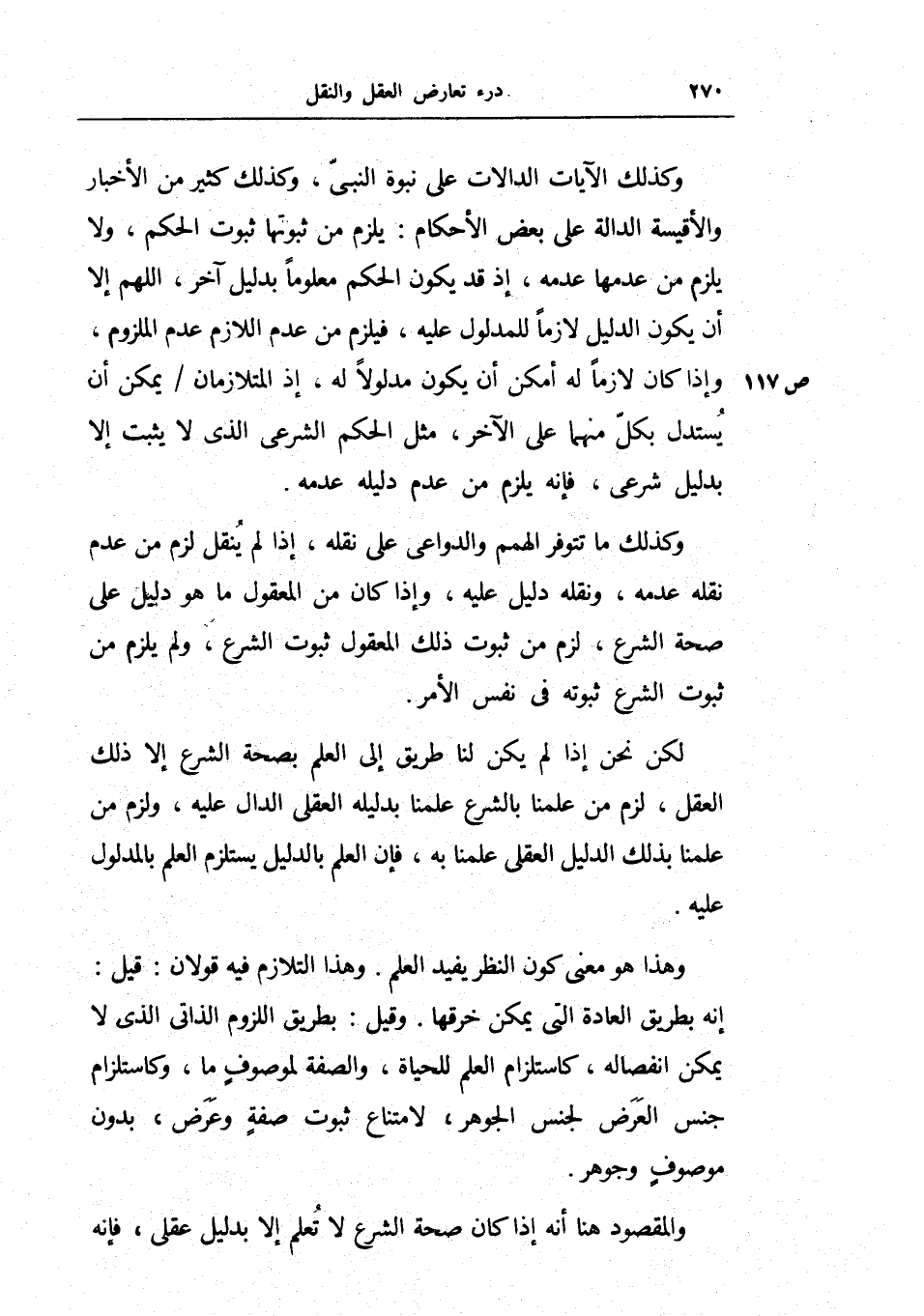 وكذلك الآيات الدالات على نبوة النبي، وكذلك كثير من الأخبار والأقيسة الدالة على بعض الأحكام: يلزم من ثبوتها ثبوت الحكم، ولا يلزم من عدمها عدمه، إذ قد يكون الحكم معلوماً بدليل آخر، اللهم إلا أن يكون الدليل لازماً للمدلول عليه، فيلزم من عدم اللازم عدم الملزوم، وإذا كان لازماً له أمكن أن يكون مدلولاً له، إذ المتلازمان يمكن أن يستدل بكل منهما على الآخر، مثل الحكم الشرعي الذي لا يثبت إلا بدليل شرعي، فإنه يلزم من عدم دليله عدمه.