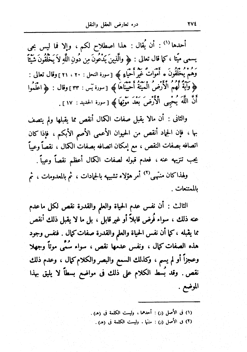 الثالث: أن نفس عدم الحياة والعلم والقدرة نقص لكل ما عدم عنه ذلك، سواء فرض قابلاً أو غير قابل، بل ما لا يقبل ذلك أنقص مما يقبله، كما أن نفس الحياة والعلم والقدرة صفات كمال.