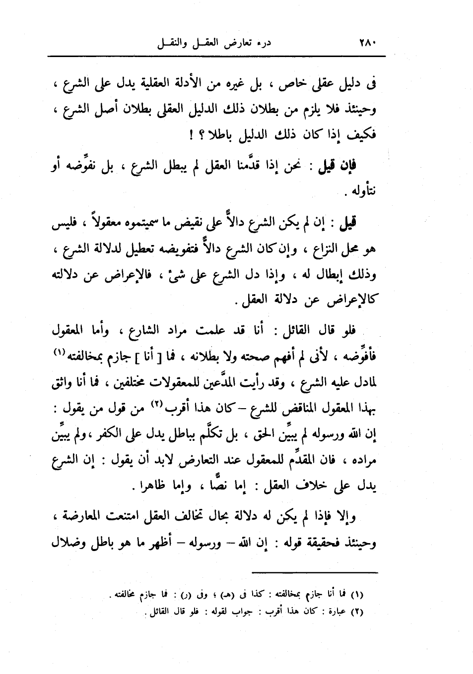 فلو قال القائل: أنا قد علمت مراد الشارع، وأما المعقول فأفوضه لأني لم أفهم صحته ولا بطلاته، فما أنا جازم بمخالفته لما دل عليه الشرع، وقد رأيت المدعين للمعقولات مختلفين، فما أنا واثق بهذا المعقول المناقض للشرع - كان هذا أقرب من قول من يقول: إن الله ورسوله لم يبين الحق، بل تكلم بباطل يدل على الكفر، ولم يبين مراده فإن المقدم للمعقول عند التعارض لا بد أن يقول: إن الشرع يدل على خلاف العقل: إما نصاً وإما ظاهرا.