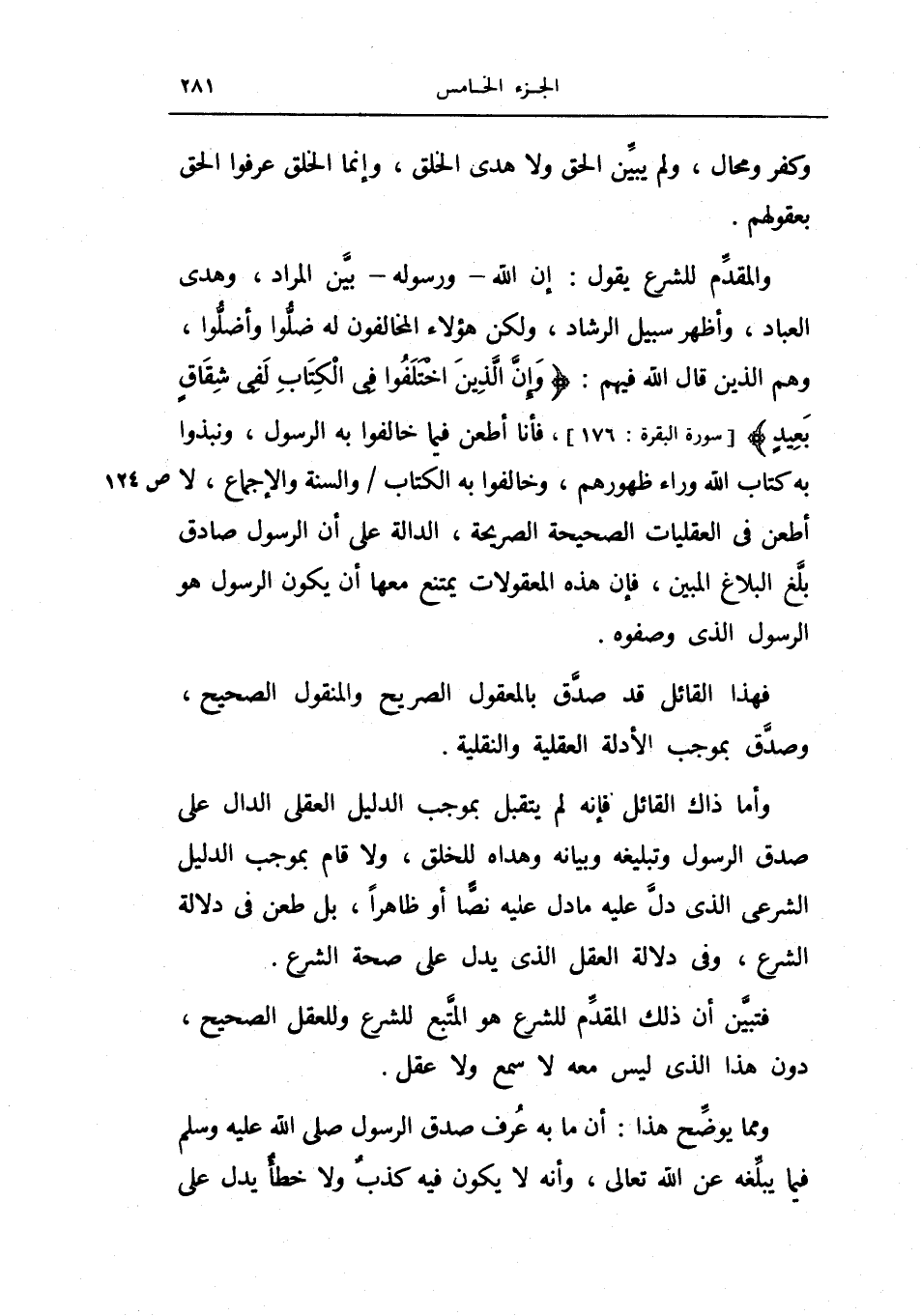والمقدم للشرع يقول: إن الله - ورسوله- بين المراد، وهدى العباد، وأظهر سبيل الرشاد، ولكن هؤلاء المخالفون له ضلوا وأضلوا، وهم الذين قال الله فيهم: {وإن الذين اختلفوا في الكتاب لفي شقاق بعيد} [البقرة: 176] ، فأنا أطعن فيما خالفوا به الرسول، ونبذوا به كتاب الله وراء ظهورهم، وخالفوا به الكتاب والسنة والإجماع، لا اطعن في العقليات الصحيحة الصريحة، الدالة على أن الرسول صادق بلغ البلاغ المبين، فإن هذه المعقولات يمتنع معها أن يكون الرسول هو الرسول الذي وصفوه.