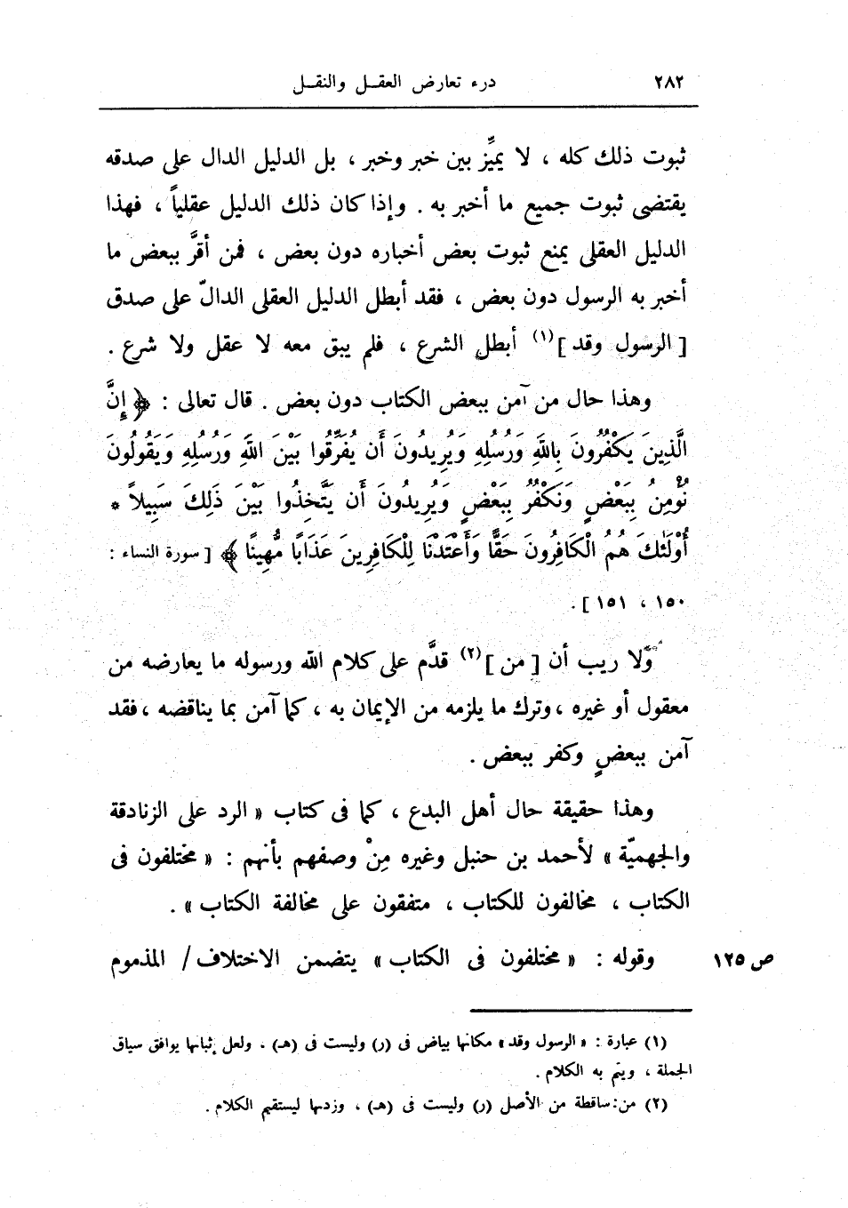 ولا ريب من أن قدم على كلام الله ورسوله وما يعارضه من معقول أو غيره، وترك ما يلزمه من الإيمان به، كما آمن بما يناقضه، فقد آمن ببعض وكفر ببعض.