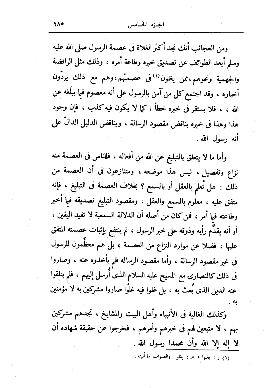 ومن العجائب أنك تجد أكثر الغلاة في عصمة الرسول صلى الله عليه وسلم أبعد الطوائف عن تصديق خبره وطاعة أمره، ذلك مثل الرافضة والجهمية ونحوهم، ممن يغلون في عصمتهم، وهم مع ذلك يردون أخباره، وقد اجتمع كل من آمن بالرسول على أنه معصوم فيما يبلغه عن الله، فلا يستقر في خبره خطأ، كما لا يكون فيه كذب، فإن وجود هذا وهذا في خبره يناقض مقصود الرسالة، ويناقض الدليل الدال على أنه رسول.
