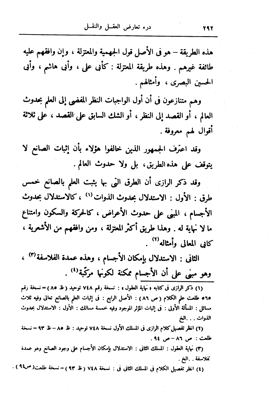 وقد ذكر الرازي أن الطرق التي بها يثبت العلم بالصانع خمس طرق: الأول: الاستدلال بحدوث الذوات، كالاستدلال بحدوث الأجسام، المبني على حدوث الأعراض، كالحركة والسكون وامتناع ما لا نهاية له.
