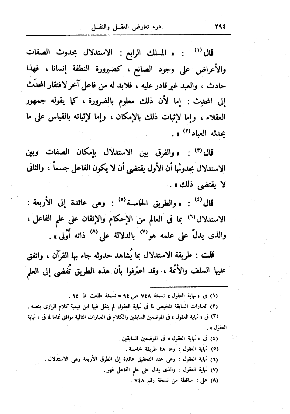 قال: (المسلك الرابع: الاستدلال بحدوث الصفات، والأعراض عن وجود الصانع، كصيرورة النطفة إنسانا، فهذا حادث، والعبد غير قادر عليه، فلا بد له من فاعل آخر لافتقار المحدث إلى المحدث: إما لأن ذلك معلوم بالضرورة، كما يقول جمهور لعقلاء، وإما لإثبات ذلك بالإمكان، وما لإثباته بالقياس على ما يحدثه العباد) .