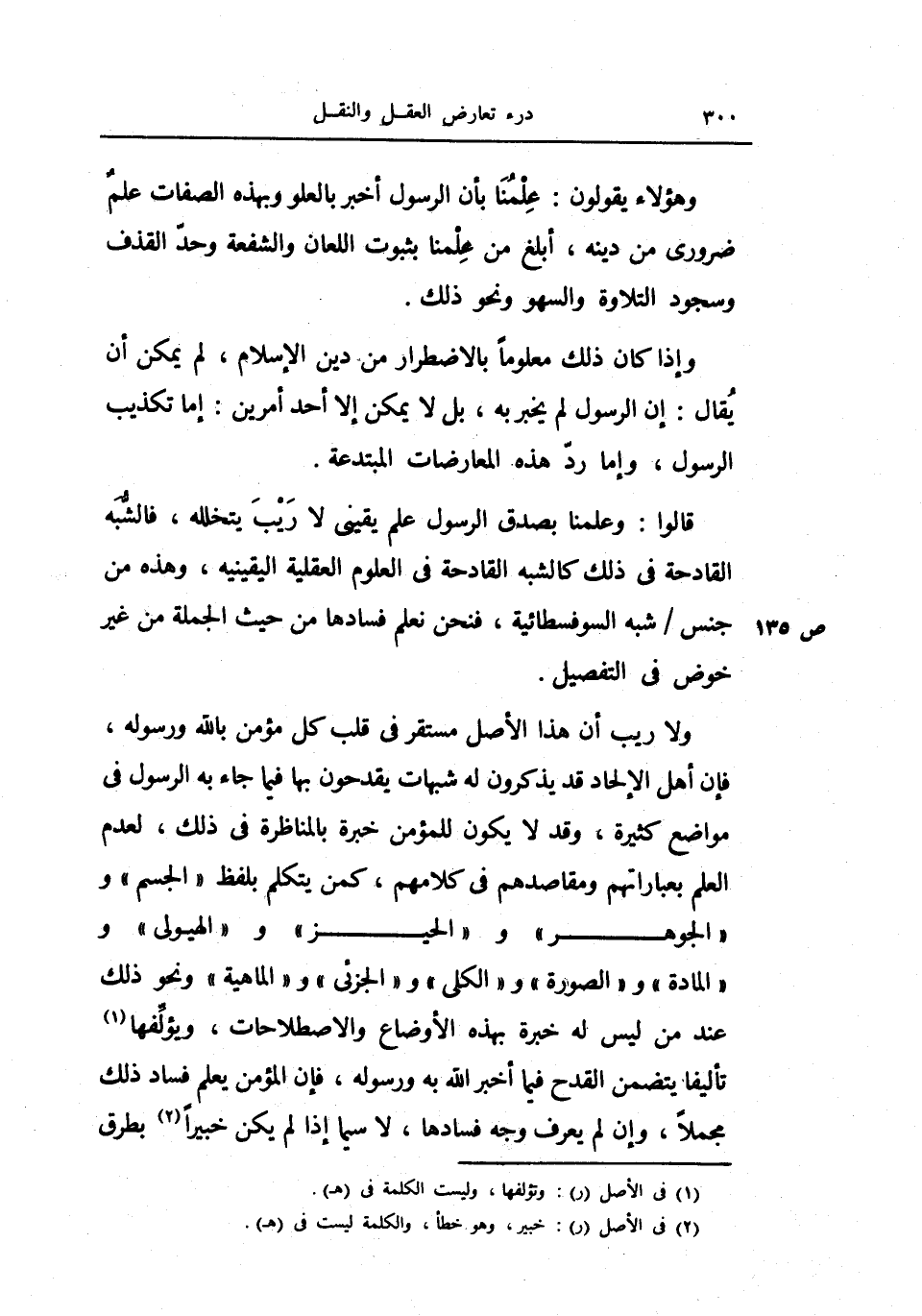 قالوا وعلمنا بصدق الرسول علم يقيني لا ريب يتخلله، فالشبه القادحة في ذلك كالشبه القادحة في العلوم العقلية اليقينية، وهذه من جنس شبه السوفسطائية، فنحن نعلم فسادها من حيث الجملة من غير خوض في التفصيل.