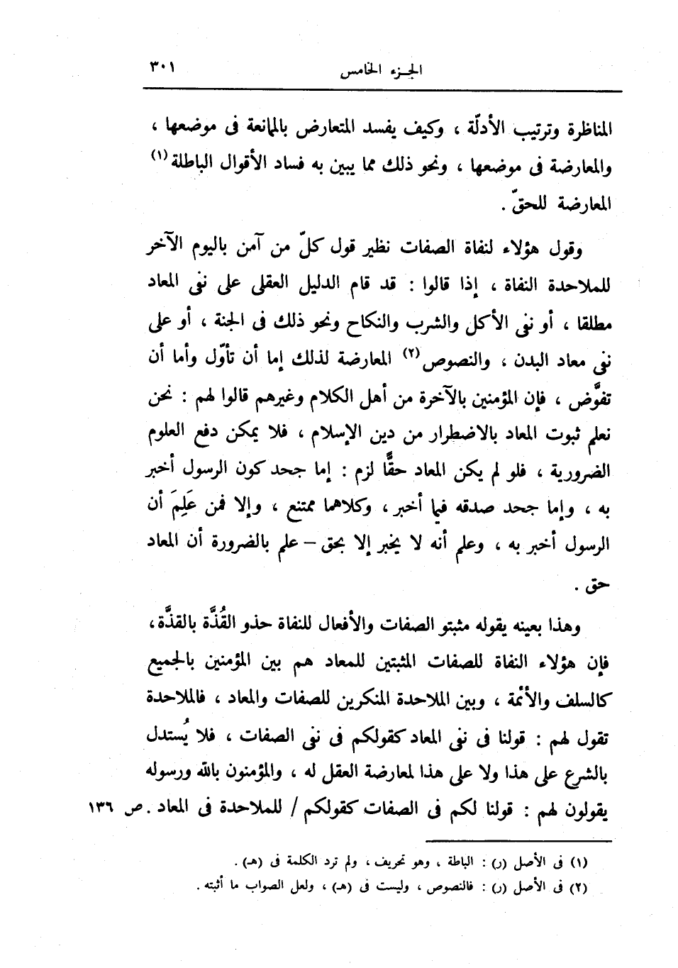 وقول هؤلاء لنفاة الصفات نظير قول كل من آمن باليوم الآخر للملاحدة النفاة، إذا قالوا: قد قام الدليل العقلي على نفي المعاد مطلقا، أو نفي الأكل والشرب والنكاح ونحو ذلك في الجنة، أو على نفي معاد البدن، والنصوص المعارضة لذلك إما أن تأول وأما أن تفوض، فإن المؤمنين بالآخرة من أهل الكلام وغيرهم قالوا لهم: نحن نعلم ثبوت المعاد بالاضطرار من دين الإسلام، فلا يمكن دفع العلوم الضرورية، فلو لم يكن المعاد حقاً لزم: إما جحد كون الرسول أخبر به، وإما جحد صدقه فيما أخبر، وكلاهما ممتنع، وإلا فمن علم أن الرسول أخبر به، وعلم أنه لا يخبر إلا بحق- علم بالضرورة أن المعاد حق.