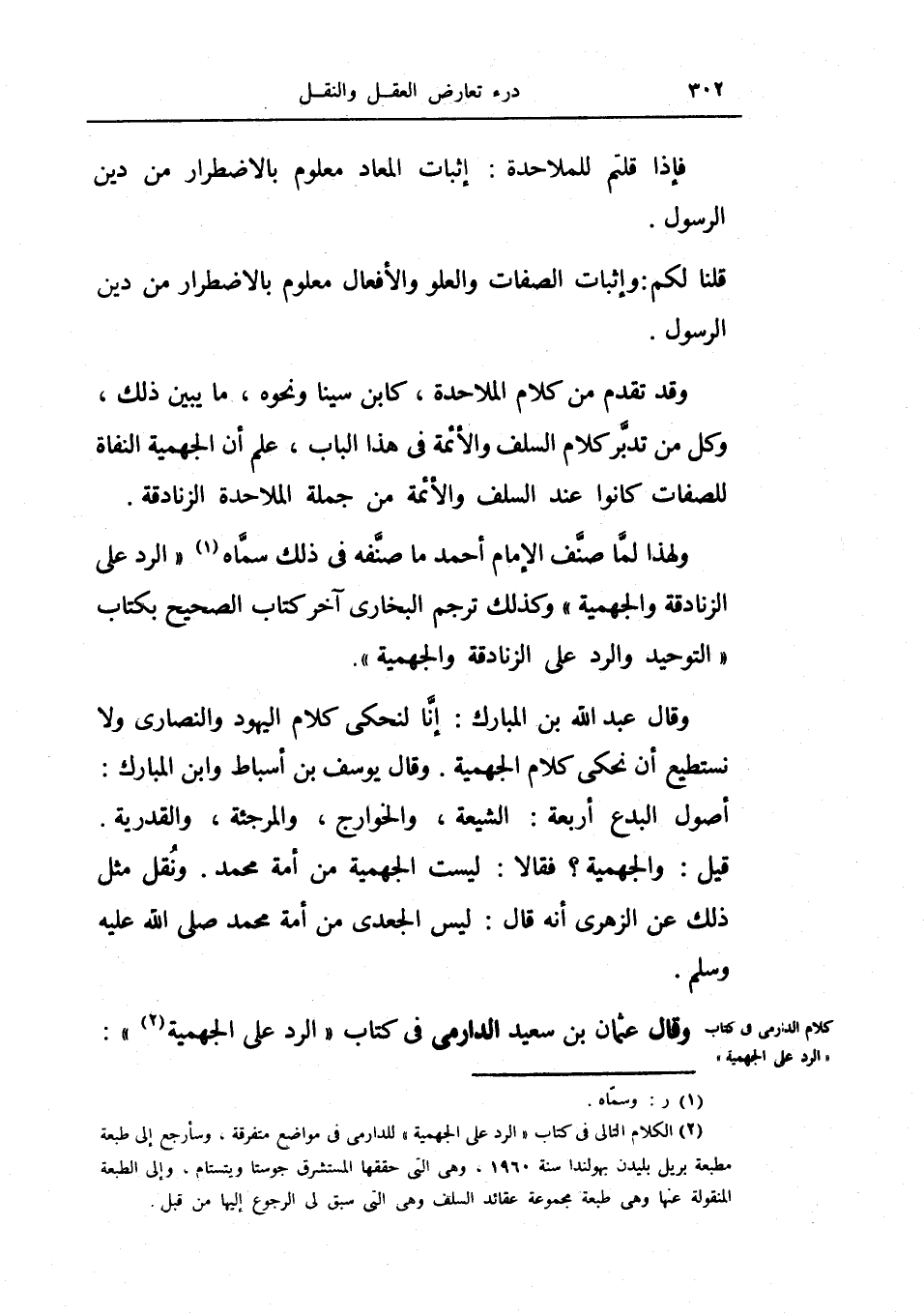 ولهذا لما صنف الإمام أحمد ما صنفه في ذلك سماه الرد على الزنادقة والجهمية وكذلك ترجم البخاري آخر كتاب الصحيح بكتاب التوحيد والرد على الزنادقة والجهمية.