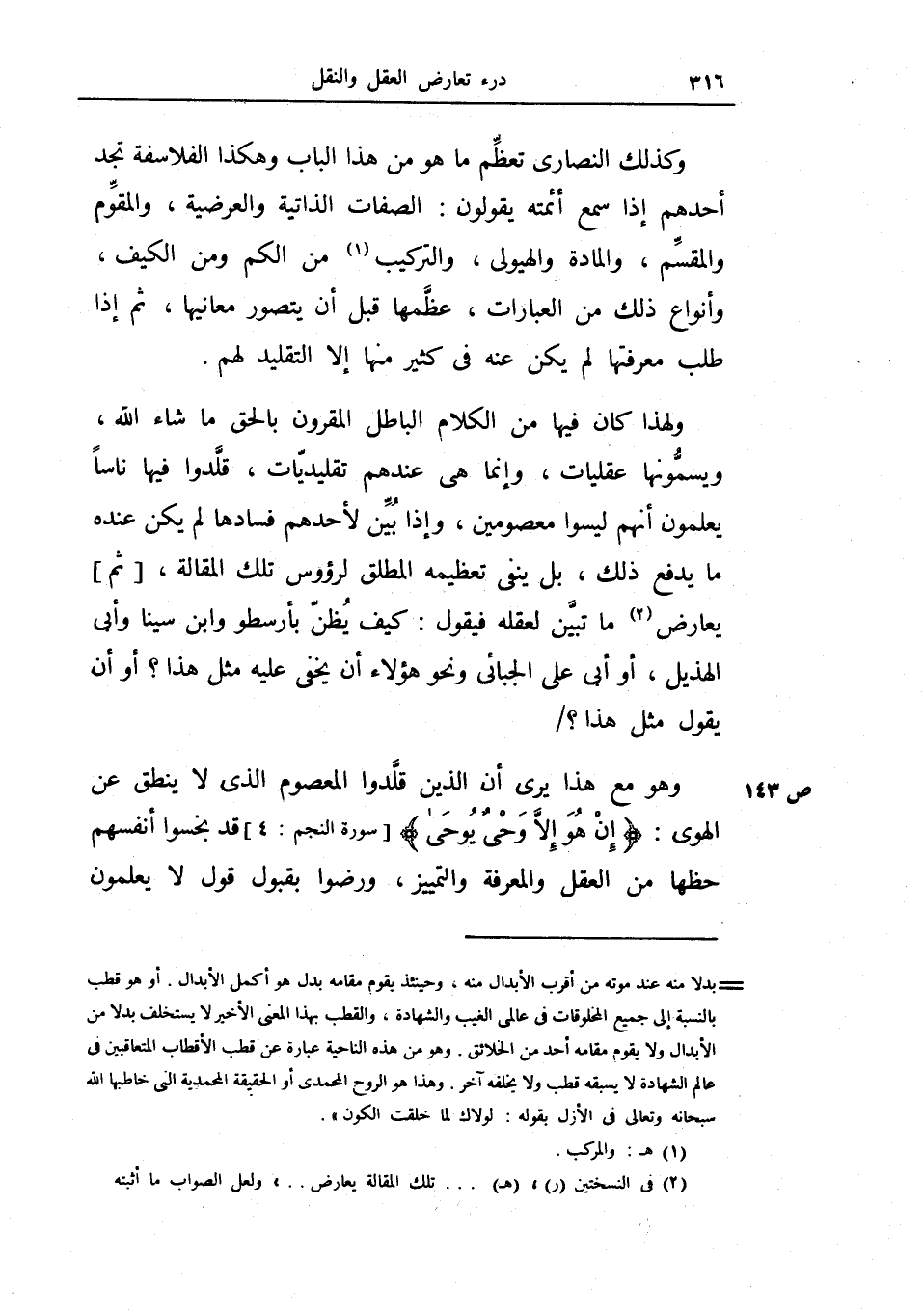 ولهذا كان فيها من الكلام الباطل المقرون بالحق ما شاء الله، ويسمونها عقليات، وإنما هي عندهم تقليديات، قلدوا فيها ناساً يعلمون أنهم ليسوا معصومين، إذا بين لأحدهم فسادها لم يكن عنده ما يدفع ذلك، بل ينفي تعظيمه المطلق لرؤوس تلك المقالة، ثم يعارض ما تبين لعقله فيقول: كيف يظن بأرسطو وابن سينا وأبي الهذيل، أو أبي علي الجبائي ونحو هؤلاء أن يخفي عليه مثل هذا؟ أو أن يقول مثل هذا؟ .