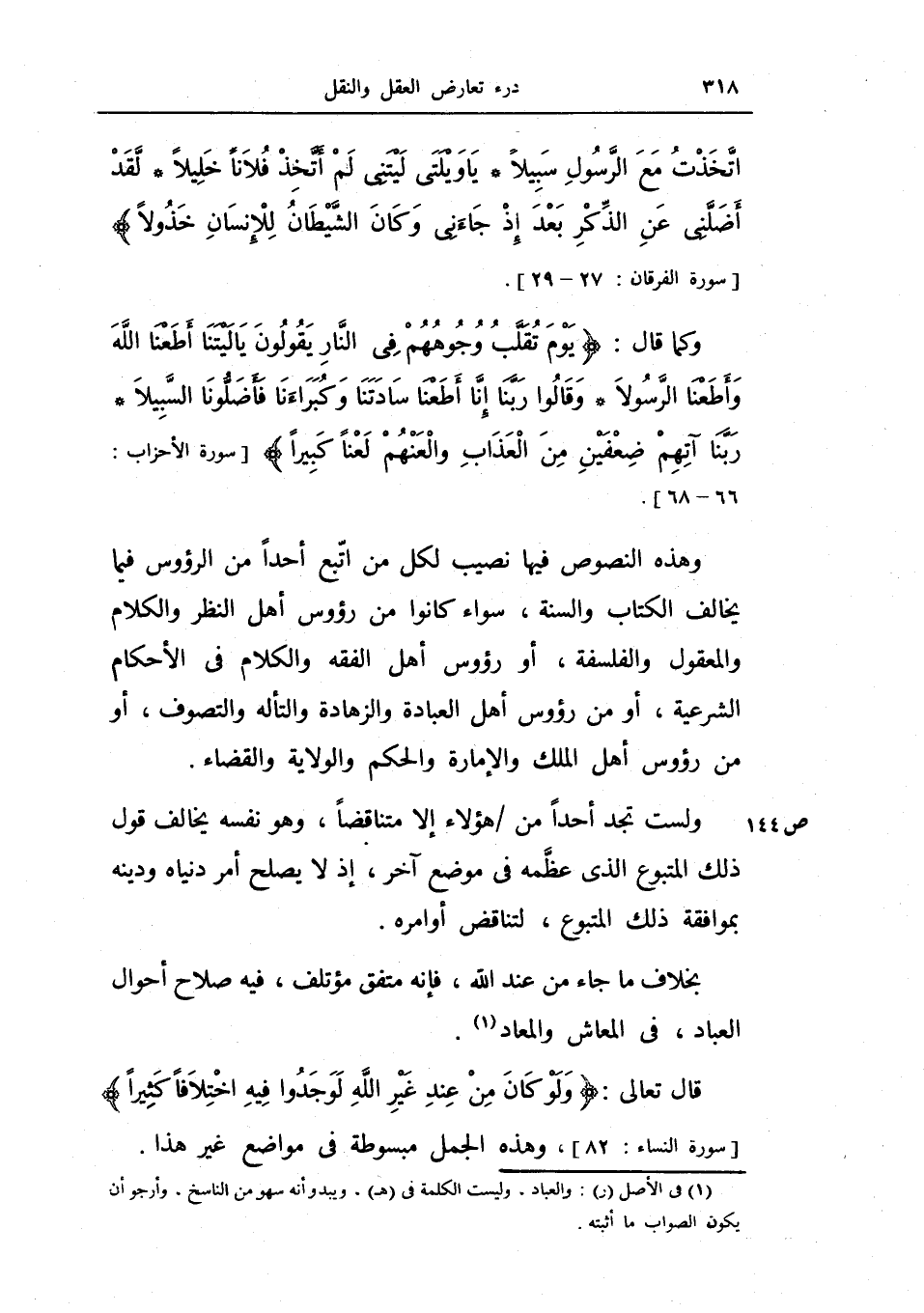 وهذه النصوص فيها نصيب لكل من اتبع أحداً من الرؤوس فيما يخالف الكتاب والسنة، سواء كانوا من رؤوس أهل النظر والكلام والمعقول والفلسفة، أو رؤوس أهل الفقه والكلام في الأحكام الشرعية، أو من رؤوس أهل العبادة والزهادة والتأله والتصوف، أو من رؤوس أهل الملك والإمارة والحكم والولاية والقضاء.