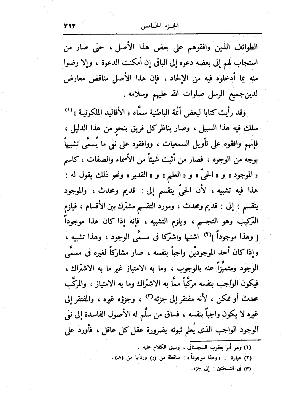 وقد رأيت كتاباً لبعض أئمة الباطنية سماه الأقاليد الملكوتية سلك فيه هذا السبيل، وصار يناظر كل فريق بنحو من هذا الدليل، فإنهم وافقوه على تأويل السمعيات، ووافقوه على نفي ما يسمى تشبيهاً بوجه من الوجوه فصار من أثبت شيئاً من الأسماء والصفات، كاسم (الموجود) و (الحي) و (العليم) و (القدير) ونحو ذلك يقول له: هذا فيه تشبيه، لأن الحي ينقسم إلى: قديم ومحدث، والموجود ينقسم: إلى قديم ومحدث، ومورد التقسيم مشترك بين الأقسام، فيلزم التركيب وهو التجسيم ويلزم التشبيه، فإنه إذا كان هذا موجوداً وهذا موجوداً اشتبها واشتركا في مسمى الوجود، وهذا تشبيه، وإذا كان أحد الموجودين واجباً بنفسه، صار مشاركاً لغيره في مسمى الوجود ومتميزاً عنه بالوجوب، وما به الامتياز غير ما به الاشترك، فيكون الواجب بنفسه مركباً مما به الاشتراك وما به الامتياز، والمركب محدث أو ممكن لأنه مفتقر إلى جزئه، وجزؤه غيره، والمفتقر إلا غيره لا يكون واجباً بنفسه، فساق من سلم له الأصول الفاسدة إلى نفي الوجود الواجب الذي يعلم ثبوته بضرورة عقل كل عاقل، فأورد على