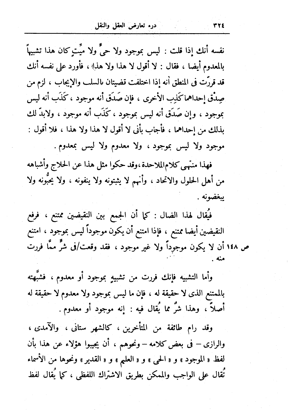 فيقال لهذا الضال: كما أن الجمع بين النقيضين ممتنع، فرفع النقيضين أيضاً ممتنع، فإذا امتنع أن يكون موجوداً ليس بموجود، امتنع أن لا يكون موجوداً ولا غير موجود فقد وقعت في شر مما فررت منه.