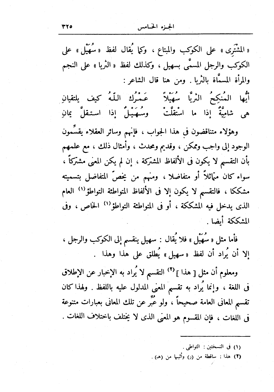 فأما مثل (سهيل) فلا يقال سهيل ينقسم إلى الكوكب والرجل، إلا أن يراد أن لفظ (سهيل) يطلق على هذا وهذا.