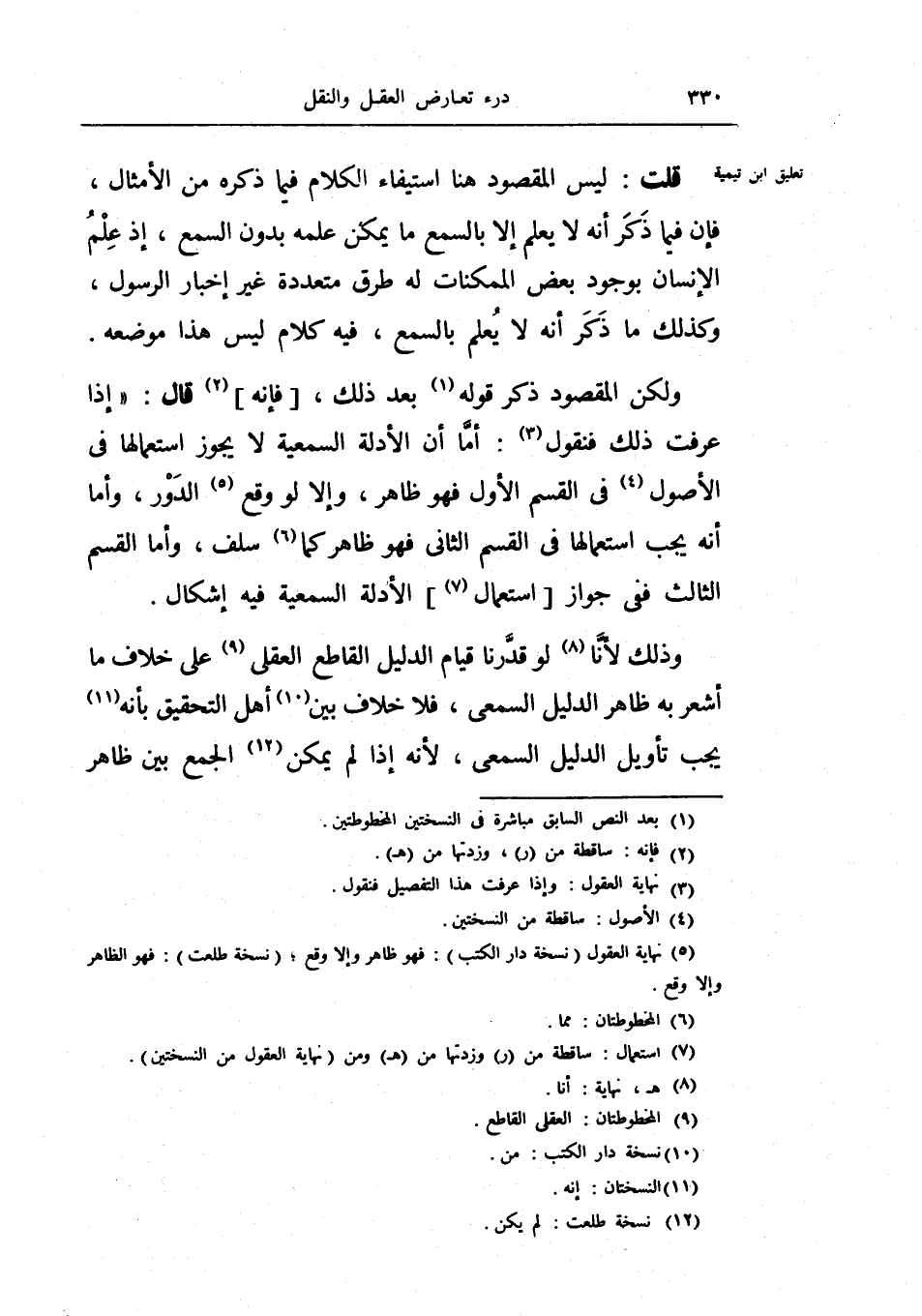 قلت: ليس المقصود هنا استيفاء الكلام فيما ذكره من الأمثال، فإن فيما ذكر أنه لا يعلم إلا بالسمع ما يمكن علمه بدون السمع، إذ علم الإنسان بوجود بعض الممكنات له طرق متعددة غير إخبار الرسول، وكذلك ما ذكر أنه لا يعلم بالسمع، فيه كلام ليس هذا موضعه.