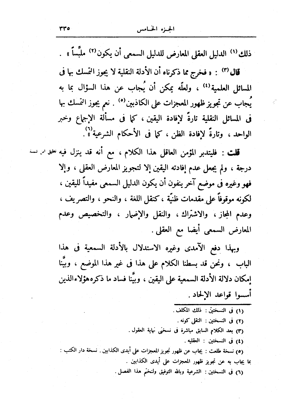 قلت فليتدبر المؤمن العاقل على هذا الكلام، مع أنه قد ينزل فيه درجة، ولم يجعل عدم إفادته اليقين إلا لتجويز المعارض العقلي، لكونه موقوفاً على مقدمات ظنية، كنقل اللغة والنحو، والتصريف وعدم المجاز، والاشتراك والنقل والإضمار، والتخصيص وعدم المعارض السمعي أيضاً مع العقلي.