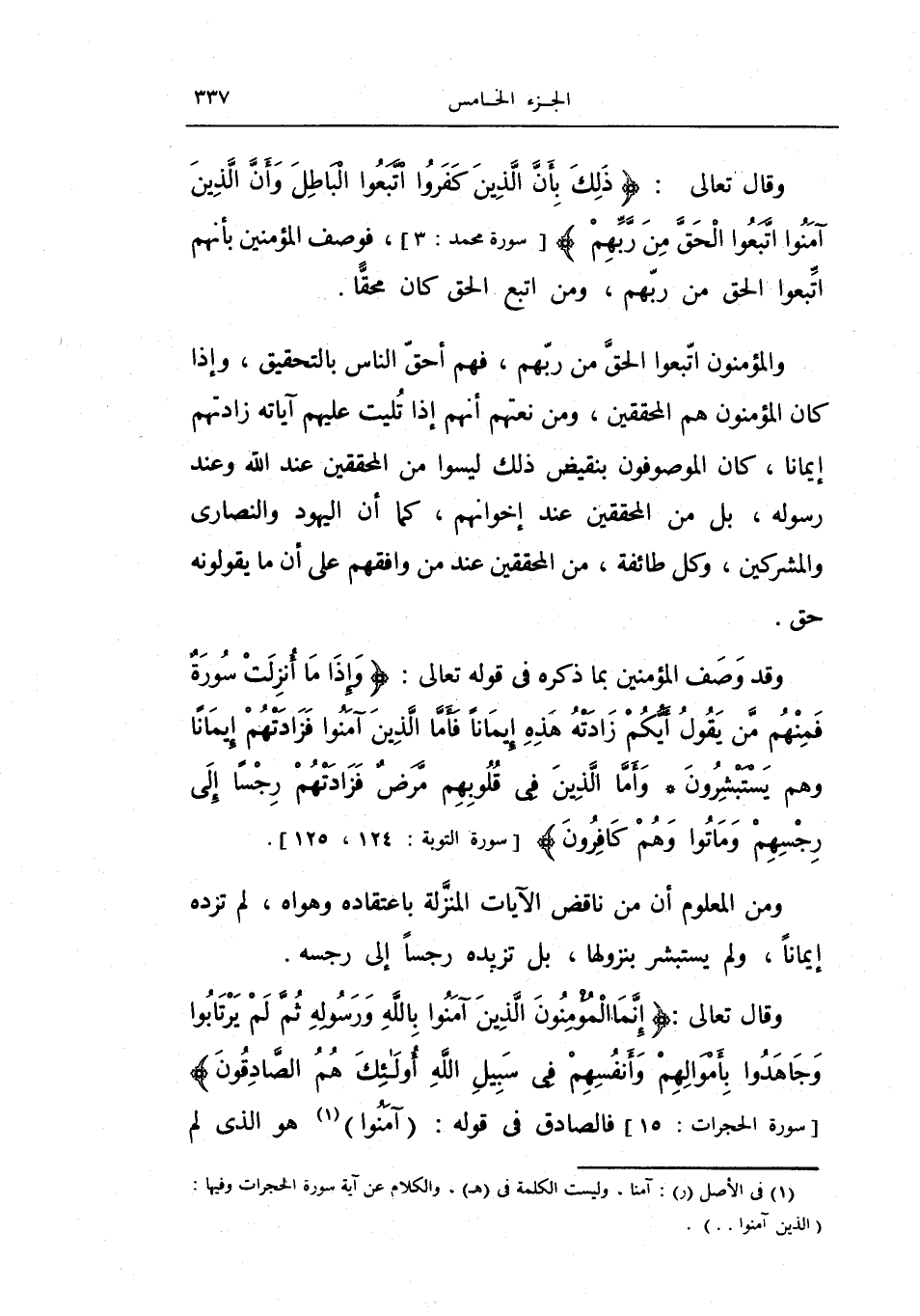 وقال تعالى: {إنما المؤمنون الذين آمنوا بالله ورسوله ثم لم يرتابوا وجاهدوا بأموالهم وأنفسهم في سبيل الله أولئك هم الصادقون} [الحجرات: 15] فالصادق في قوله: آمنوا هو الذي لم