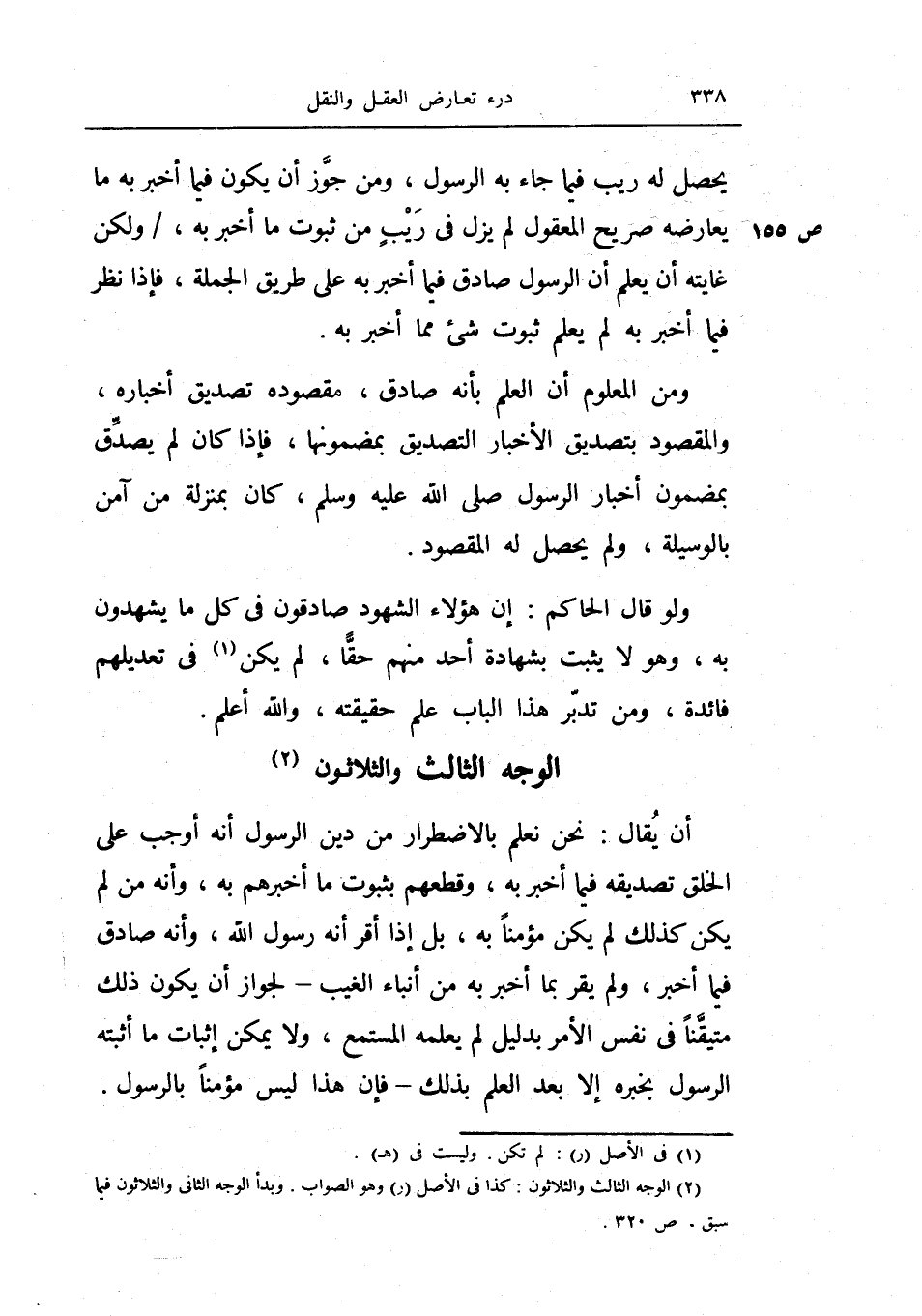 يحصل له ريب فيما جاء به الرسول، ومن جوز أن يكون فيما أخبر به ما يعارضه صريح المعقول لم يزل في ريب من ثبوت ما أخبر به، ولكن غايته أن يعلم أن الرسول صادق فيما أخبر به على طريق الجملة، فإذا نظر فيما أخبر به لم يعلم ثبوت شيء مما أخبر به.
