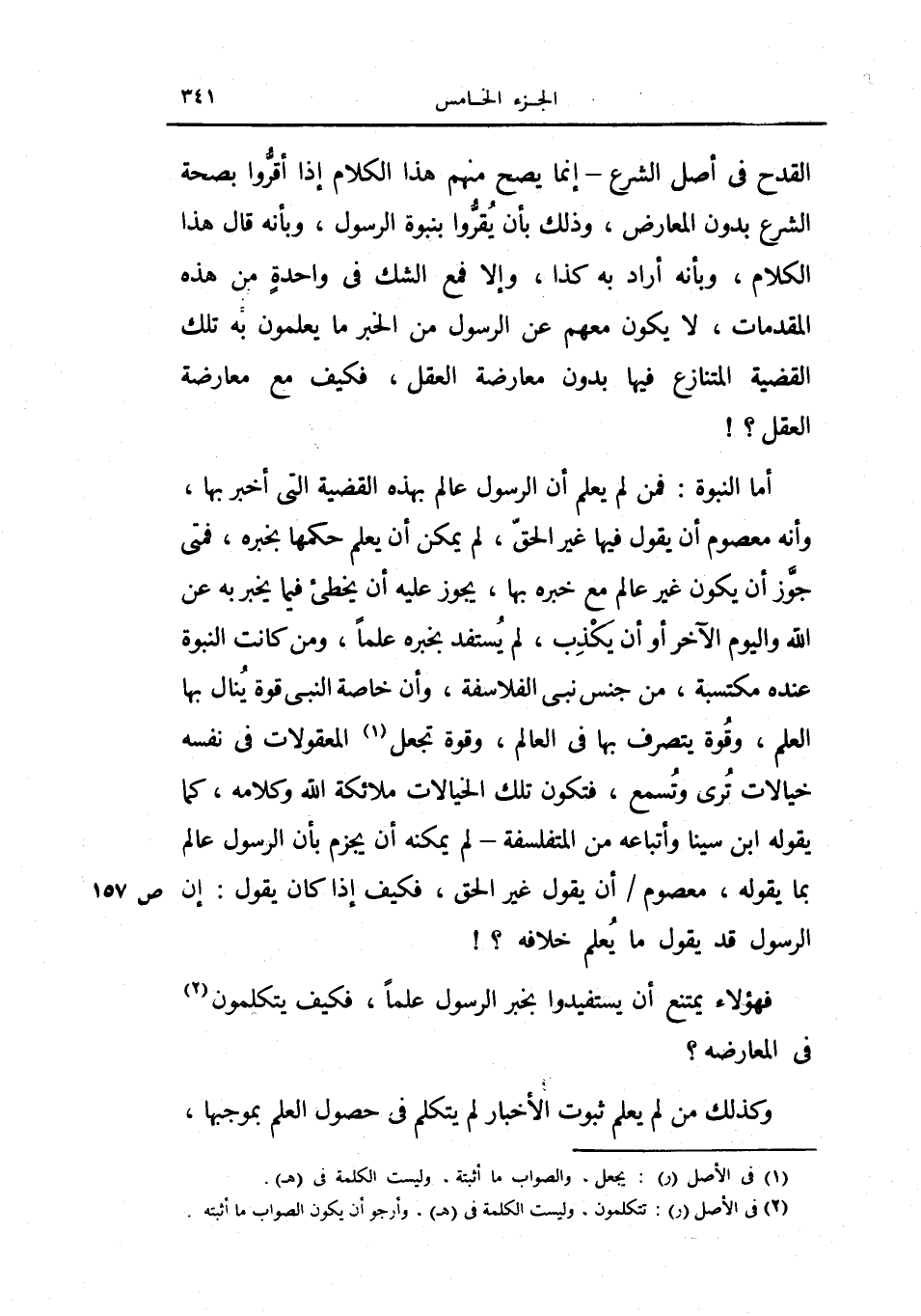 القدح في أصل الشرع - إنما يصح منهم هذا الكلام إذا أقروا بصحة الشرع بدون المعارض، وذلك بأن يقروا بنبوة الرسول، وبأنه قال هذا الكلام، وبأنه أراد به كذا، وإلا فمع الشك في واحدة من هذه المقدمات، لا يكون معهم عن الرسول من الخبر ما يعلمون به تلك القضية المتنازع فيها بدون معارضة العقل، فكيف مع معارضة العقل، أما النبوة: فمن لم يعلم أن الرسول عالم بهذه القضية التي أخبر بها، وأنه معصوم أن يقول فيها غير الحق، لم يمكن أن يعلم حكمها بخبره، فمتى جوز أن يكون غير عالم مع خبره بها، يجوز عليه أن يخطئ فيما يخبر به عن الله واليوم الآخر أو أن يكذب، لم يستفد بخبره علماً، ومن كانت النبوة عنده مكتسبة، من جني نبي الفلاسفة، وأن خاصة النبي قوة ينال بها العلم، وقوة بتصرف بها في العلم، وقوة تجعل من المعقولات في نفسه خيالات ترى وتسمع، فتكون تلك الخيالات ملائكة الله وكلامه، كما يقول ابن سينا وأتباعه من المتفلسفة - لم يمكنه أن يجزم بأن الرسول عالم بما يقوله، معصوم أن يقول غير الحق، فكيف إذا كان يقول: إن الرسول قد يقول ما يعلم خلاف.
