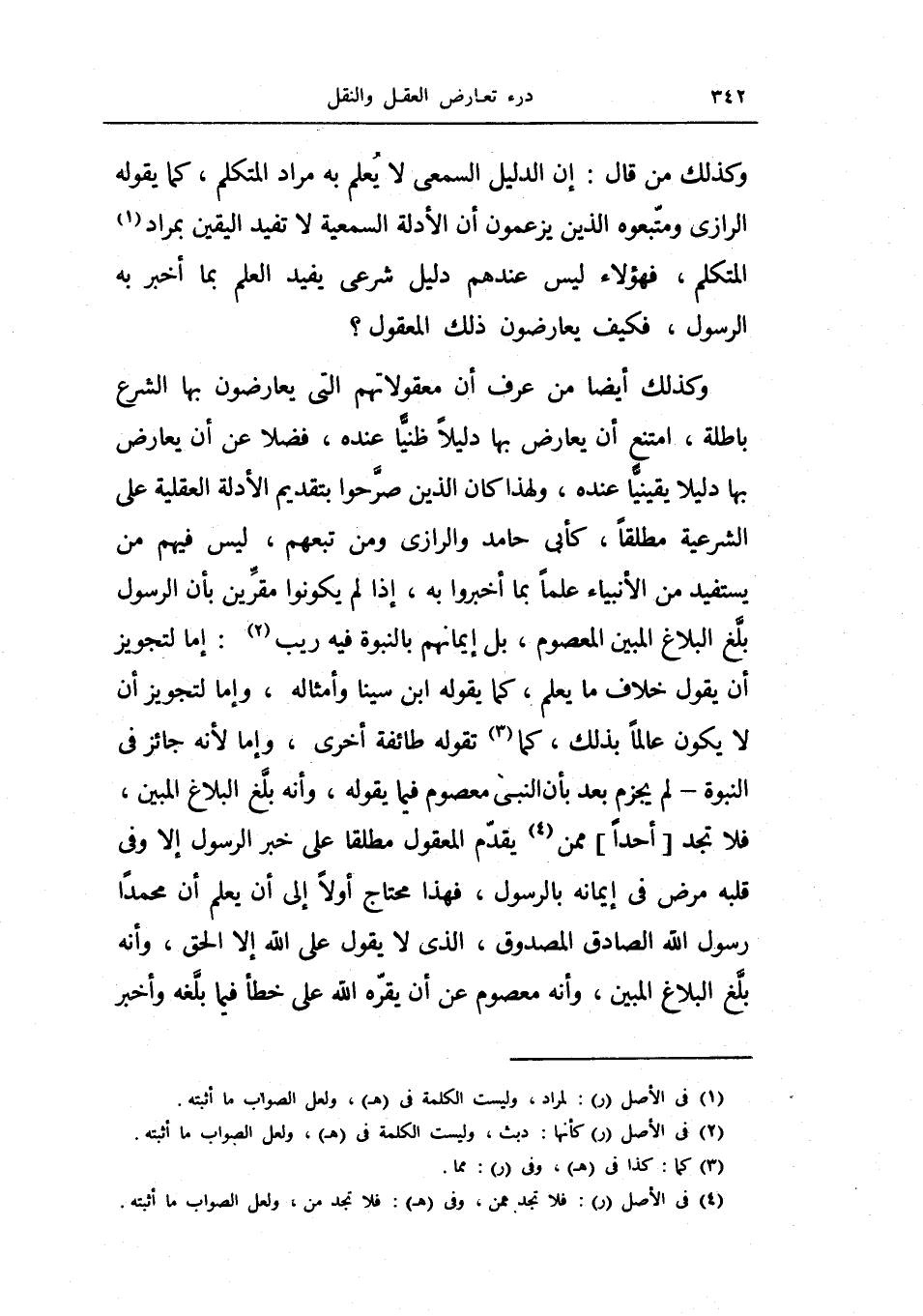 وكذلك أيضا من عرف أن معقولاتهم التي يعارضون بها الشرع باطلة، امتنع أن يعارض بها دليلاً ظنياً عنده، فضلاً عن أن يعارض بها دليلا يقينياً عنده، ولهذا كان الذين صرحوا بتقديم الأدلة العقلية على الشرعية مطلقاً، كأبي حامد والرازي ومن تبعهم، ليس فيهم من يستفيد من الأنبياء علماً بما أخبروا به، إذا لم يكونوا مقرين بأن الرسول بلغ البلاغ المبين المعصوم، بل إيمانهم بالنبوة فيه ريب: إما لتجويز أن يقول خلاف ما يعلم، كما يقول ابن سينا وأمثاله، وإما لتجويز أن يكون لا عالماً بذلك، كما تقوله طائفة أخرى، وإما لأنه جائز في النبوة - لم يجزم بعد بأن النبي معصوم فيما يقوله، وأنه بلغ البلاغ المبين، فلا تجد أحداً ممن يقدم المعقول مطلقاً على خبر الرسول إلا وفي قلبه مرض في إيمانه بالرسول، فهذا محتاج أولاً إلى أن يعلم أن محمداً رسول الله الصادق المصدوق، الذي لا يقول على الله إلا الحق، وأنه بلغ البلاغ المبين، وأنه معصوم عن أن يقره الله على خطأ فيما بلغه وأخبر