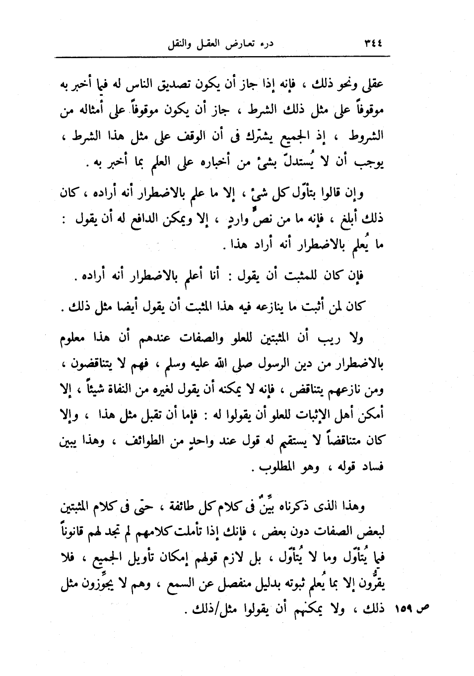 ولا ريب أن المثبتين للعلو والصفات عندهم أن هذا معلوم بالاضطرار من دين الرسول صلى الله عليه وسلم، فهم لا يتناقضون، ومن نازعهم يتناقض، فإنه لا يمكنه أن يقول لغيره من النفاة شيئاً، إلا أمكن أهل الإثبات للعلو أن يقولوا له: فإما أن تقبل مثل هذا، وإلا كان متناقضاً لا يستقيم له قول عند واحد من الطوائف، وهذا يبين فساد قوله وهو المطلوب.