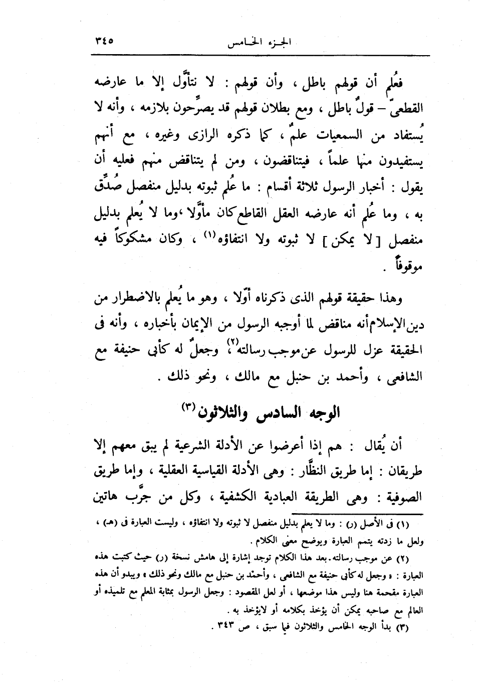 فعلم أن قولهم باطل، وأن قولهم: لا نتأول إلا ما عارضه القطعي - قول باطل، ومع بطلان قولهم قد يصرحون بلازمه، وأنه لا يستفاد من السمعيات علم، كما ذكره الرازي وغيره، مع انهم يستفيدون منها علماً، فيتناقضون، ومن لم يتناقض منهم فعليه أن يقول: أخبار الرسول ثلاثة أقسام: ما علم ثبوته بدليل منفصل صدق به، وما علم أنه عارضه العقل القاطع كان مأولا، وما لا يعلم بدليل منفصل لا يمكن ثبوته ولا انتفاؤه، وكان مشكوكاً فيه موقوفاً.