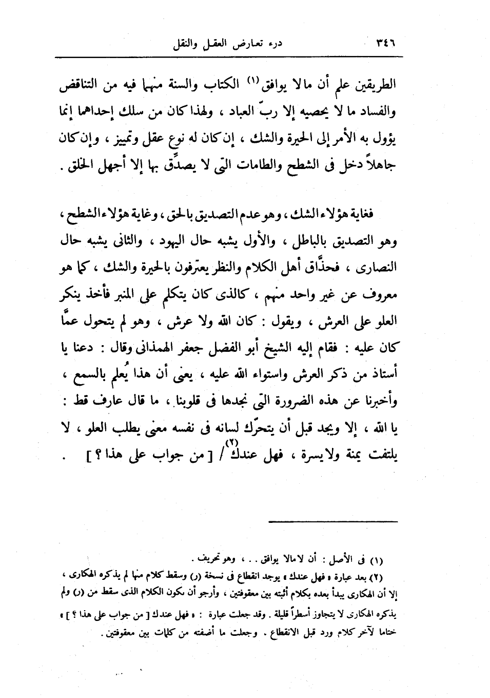 فغاية هؤلاء الشك، وهو عدم التصديق بالحق، وغاية هؤلاء الشطح وهو التصديق بالباطل، والأول يشبه حال اليهود، والثاني يشبه حال النصارى، فحذاق أهل الكلام والنظر يعترفون بالحيرة والشك كما هو معروف عن غير واحد منهم، كالذي كان يتكلم على المنبر فأخذ ينكر العلو على العرش، ويقول: كان الله ولا عرش، وهو لم يتحول عما كان عليه: فقام إليه الشيخ أبو الفضل جعفر الهمذاني وقال: دعنا يا أستاذ من ذكر العرش واستواء الله عليه، يعني أن هذا يعلم بالسمع، وأخبرنا عن هذه الضرورة التي نجدها في قلوبنا، ما قال: عارف قط: يا الله، إلا ويجد قبل أن يتحرك لسانه في نفسه معنى يطلب العلو، لا يلتفت يمنة ولا يسرة، فهل عندك من جواب على هذا.