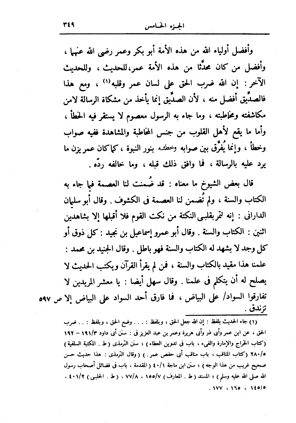 وأفضل أولياء الله من هذه الأمة أبو بكر وعمر رضي الله عنهما، وأفضل من كان محدثاً من هذه الأمة عمر، للحديث وللحديث الآخر: «إن الله ضرب الحق على لسان عمر وقلبه» ، ومع هذا فالصديق أفضل منه، لأن الصديق إنما يأخذ من مشكاة الرسالة لا من مكاشفته ومخاطبته، وما جاء به الرسول معصوم لا يستقر فيه الخطأ، وأما ما يقع لأهل القلوب من جنس المخاطبة والمشاهدة ففيه صواب وخطأ، وإنما يفرق بين صوابه وخطائه بنور النبوة، كما كان عمر يزن ما يرد عليه بالرسالة، فما وافق ذلك قبله، وما خالفه رده.