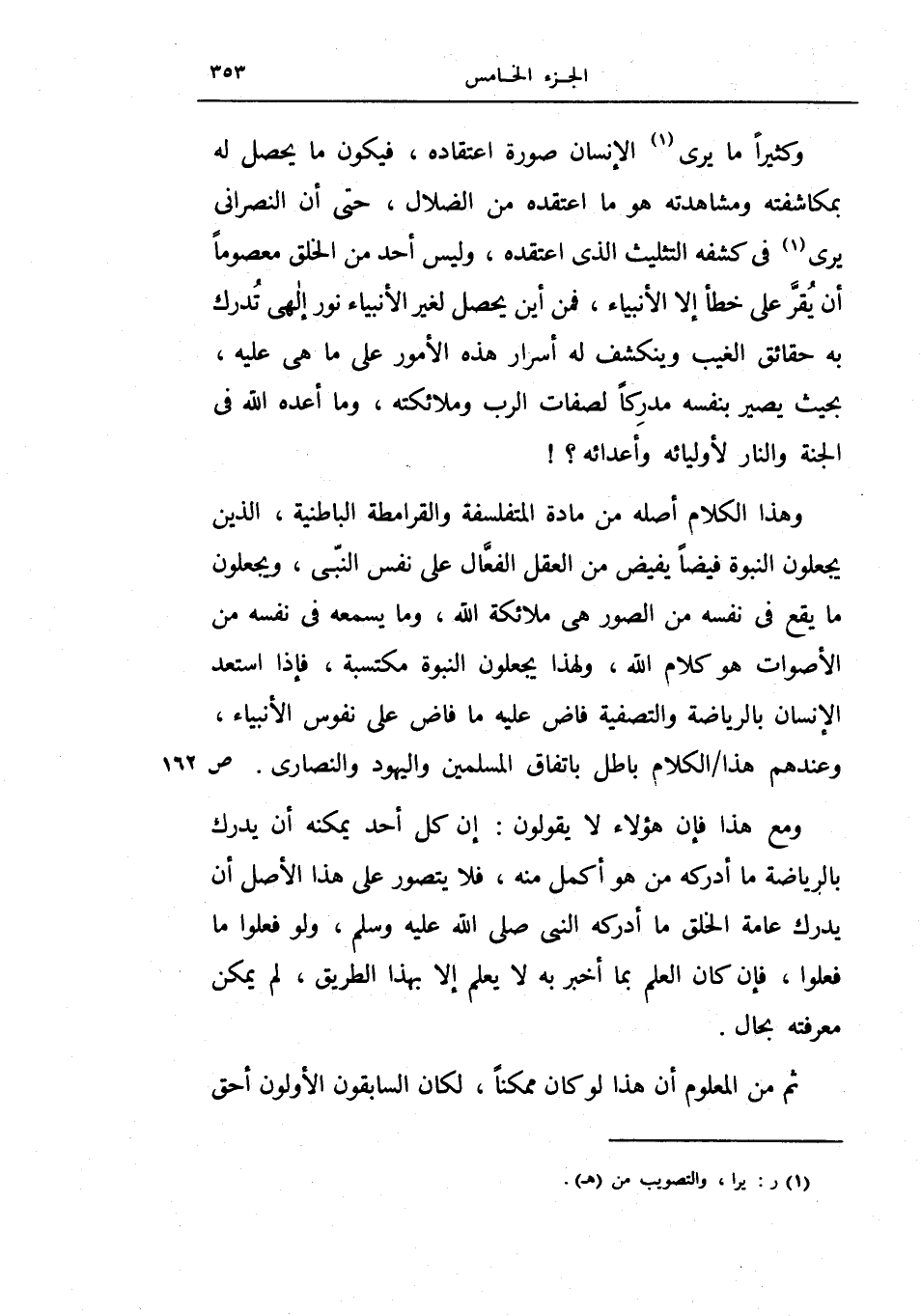 وكثيراً ما يرى الإنسان صورة اعتقاده، فيكون ما يحصل له بمكاشفته ومشاهدته هو ما اعتقده من الضلال، حتى أن النصراني يرى في كشفه التثليث الذي اعتقده، وليس أحد من الخلق معصوماً أن يقر على خطأ إلا الأنبياء، فمن أين يحصل لغير الأنبياء نور إلهي تدرك به حقائق الغيب وينكشف له أسرار هذه الأمور على ما هي عليه، بحيث يصير بنفسه مدركاً لصفات الرب وملائكته، وما أعده الله في الجنة والنار لأوليائه وأعدائه؟ .