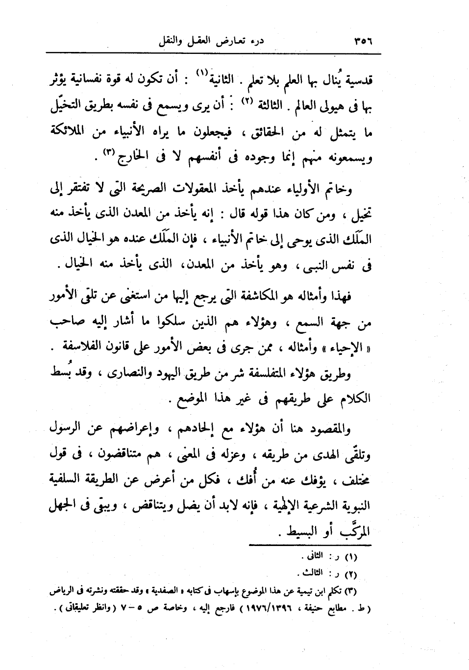 الثالثة: أن يرى ويسمع في نفسه بطريق التخيل ما يتمثل له من الحقائق، فيجعلون ما يراه الأنبياء من الملائكة ويسمعونه منهم إنما وجوده في أنفسهم لا في الخارج.