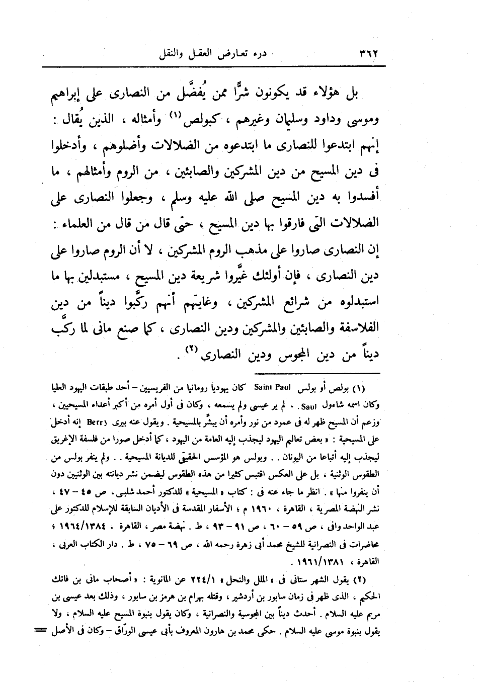 بل هؤلاء قد يكونون شراً ممن يفضل من النصارى على إبراهيم وموسى وداود وسليمان وغيرهم، كبولص وأمثاله، الذين يقال: إنهم ابتدعوا للنصارى ما ابتدعوه من الضلالات وأضلوهم، وأدخلوا في دين المسيح من دين المشركين والصائبين، ومن الروم وأمثالهم، ما أفسدوا به دين المسيح صلى الله عليه وسلم، وجعلوا النصارى على الضلالات التي فارقوا بها دين المسيح، حتى قال من قال من العلماء: إن النصارى صاروا على مذهب الروم المشركين، لا أن الروم صاروا على دين النصارى، فإن أولئك غيروا شريعة دين المسيح، مستبدلين بها ما استبدلوه من شرائع المشركين، وغايتهم أنهم ركبوا ديناً من دين الفلاسفة والصائبين والمشركين ودين النصارى، كما صانع ماني لما ركب ديناً من دين المجوس ودين النصارى.
