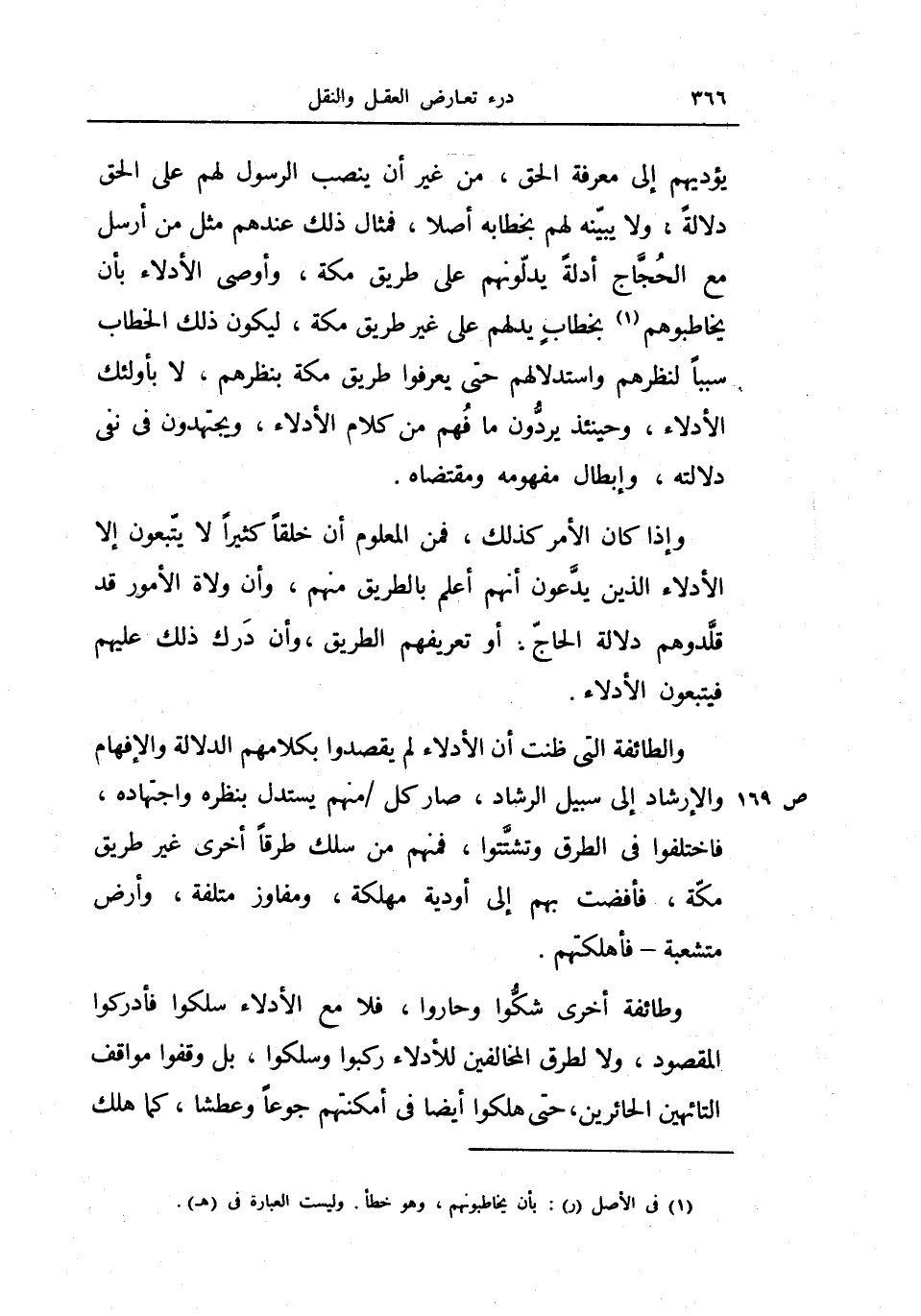 وإذا كان لأمر كذلك، فمن المعلوم أن خلقاً كثيراً لا يتبعون إلا الأدلاء الذين يدعون انهم أعلم بالطريق منهم، وأن ولاة الأمور قد قلدوهم دلالة الحاج، أو تعريفهم الطريق، وإن درك ذلك عليهم فيتبعون الأدلاء.